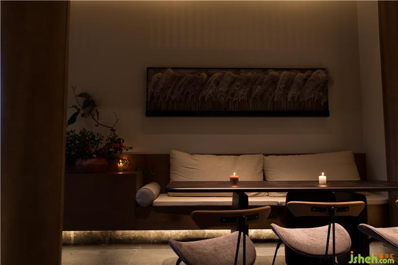 卡座區(qū)位于酒吧空間最里的位置,墻面的蘆葦裝置內(nèi)設(shè)燈光,裝修設(shè)計(jì)打造出蘆葦似動非動的搖曳感,卡其色軟包與粗麻編制的紋案形成強(qiáng)烈的反差感,體現(xiàn)出小漁村的古樸安靜的氛圍。