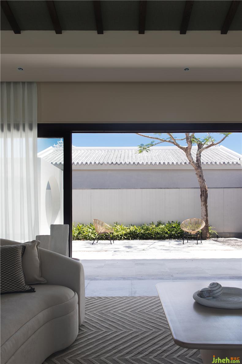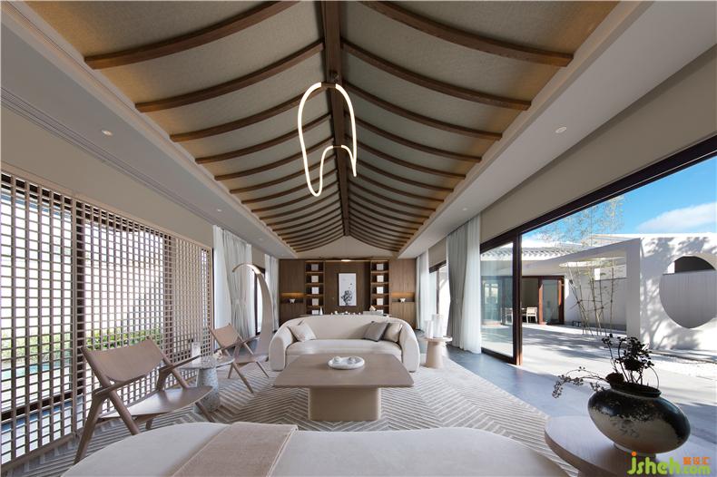 客廳選用具有柔和弧度的家具,模擬候鳥的姿態(tài),營(yíng)造自然的美感,掛畫也選用盛昌年的《柳燕圖》圍繞主題,旁邊的茶室以及餐廳也都選用平靜舒服的色調(diào),其中燈家具形態(tài)也以“候鳥南飛”、海上礁石為靈感,在空間的飾品選擇上秉承著少精于多的理念,多選用自然質(zhì)感的器皿飾品等,讓整個(gè)空間顯得精致卻不世俗,自然氣息也更加濃厚。
