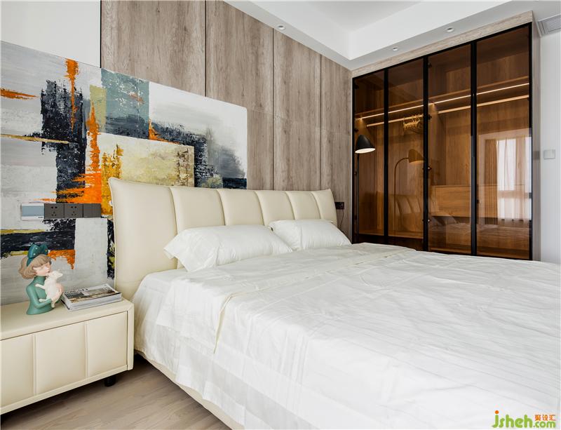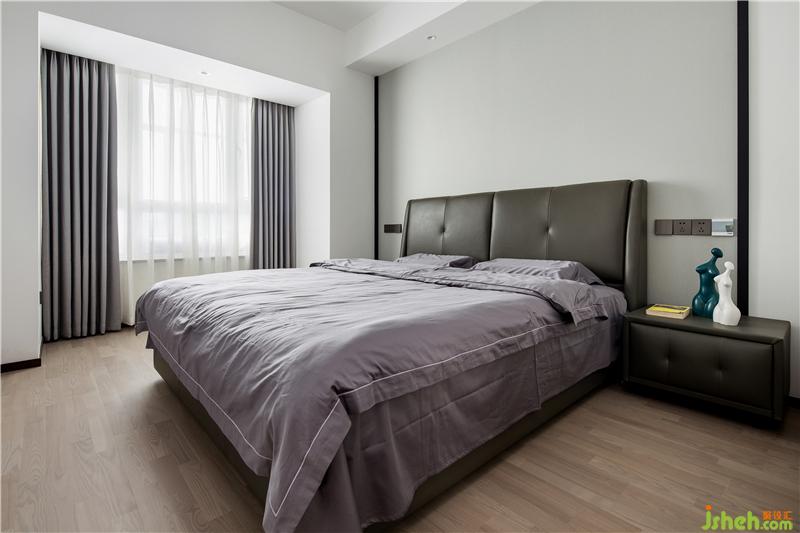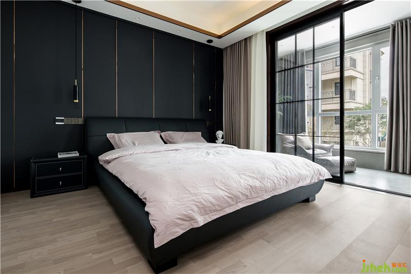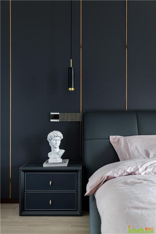 主臥定了深色的基調(diào),原本硬包的背景后來改為板材,干練許多。這樣大膽的空間搭配得益于甲乙雙方高級別的信任,落地后的效果可以消滅一切懷疑。地板用了金鋼鉑林的進(jìn)口系列,質(zhì)感確實(shí)不錯。