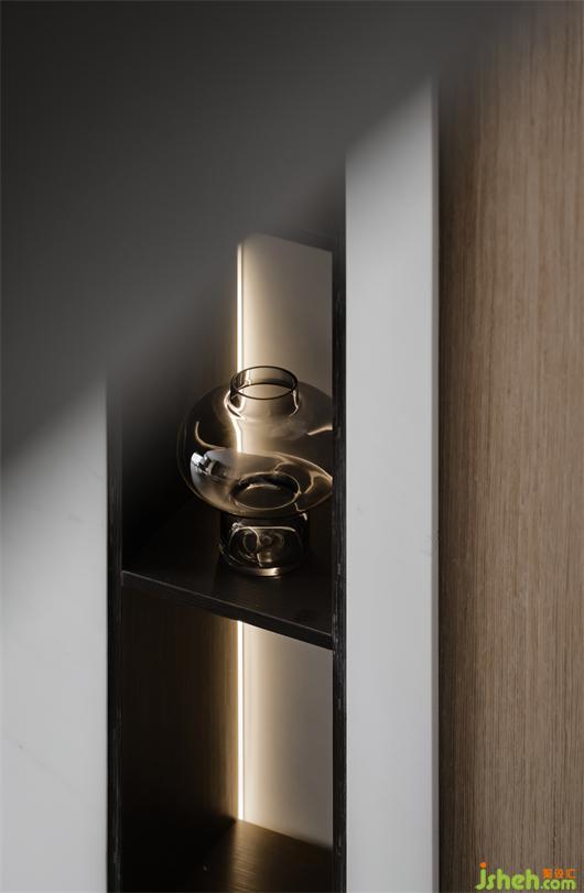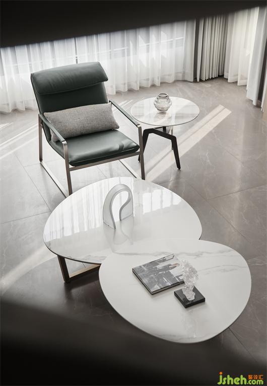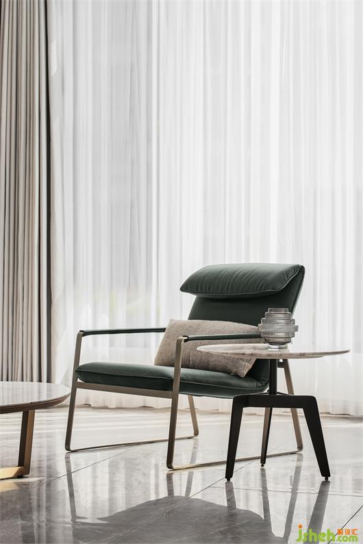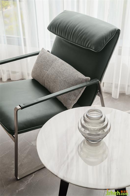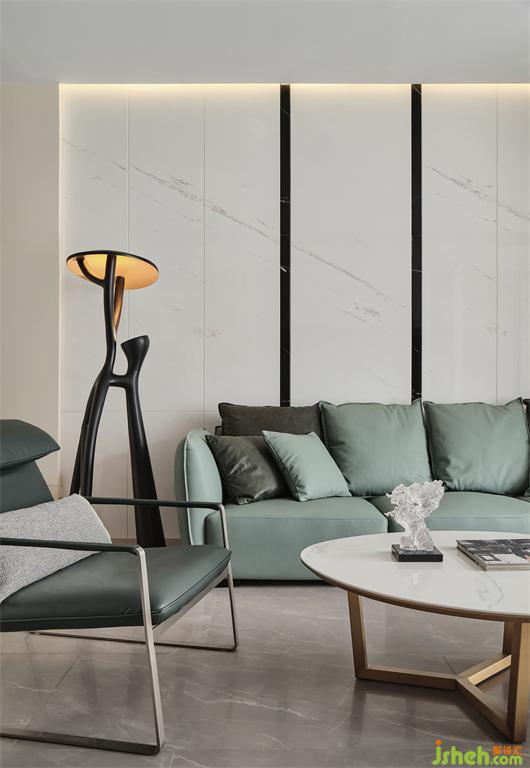 灰綠的小牛皮沙發(fā)旁立著黑色樹杈落地燈