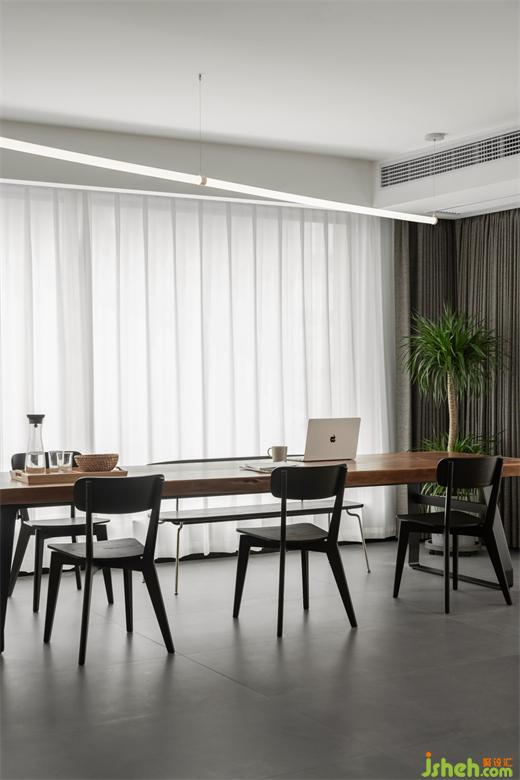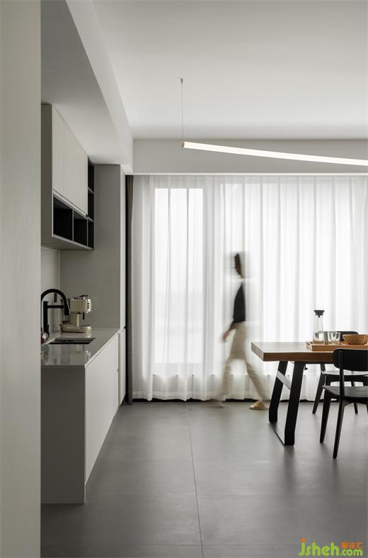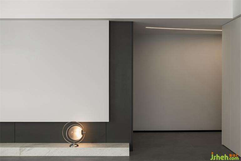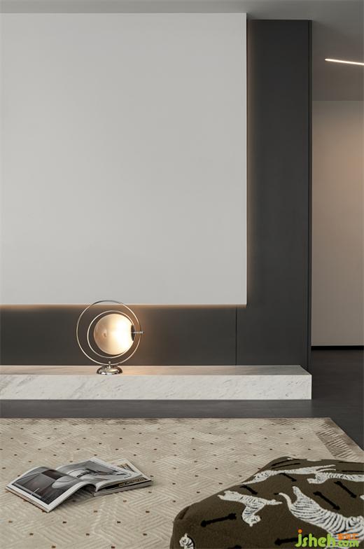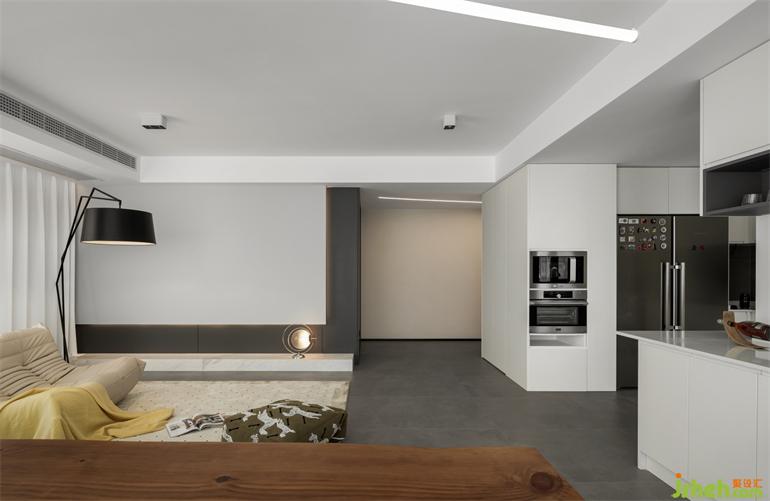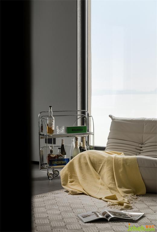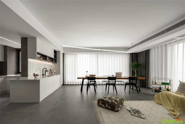 藝術(shù)住宅設(shè)計(jì)極窄邊框的大落地玻璃把江景收入“畫框”,室內(nèi)外的互動(dòng)讓居家美學(xué)呈現(xiàn)出自然的藝術(shù)。大橫廳的頂上斜吊一道光柱,從廚房門口延伸至長(zhǎng)桌盡頭。藝術(shù)住宅設(shè)計(jì)水泥灰的地磚鋪陳出極簡(jiǎn)精致生活的底色?!懊x”沙發(fā)背后矗立的投影儀代替電視機(jī)為生活增添了歡樂的劇情。