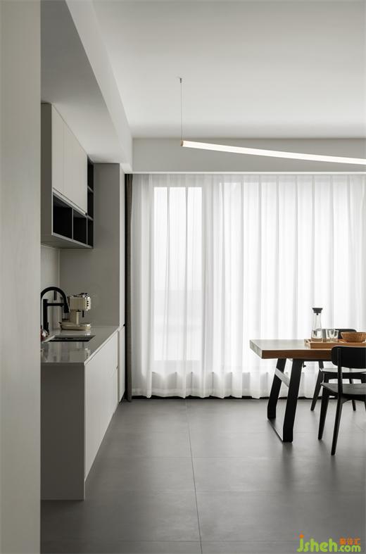 The large floor glass with extremely narrow frame integrates the river scenery into the "picture frame", and the indoor and outdoor interaction makes the home aesthetics present a natural art. A light column is hung on the top of the large horizontal hall, extending from the kitchen door to the end of the long table. The cement grey floor tiles display the background color of minimalist and exquisite life. The projector standing behind the "Caterpillar" sofa replaces the TV to add a happy plot to life.