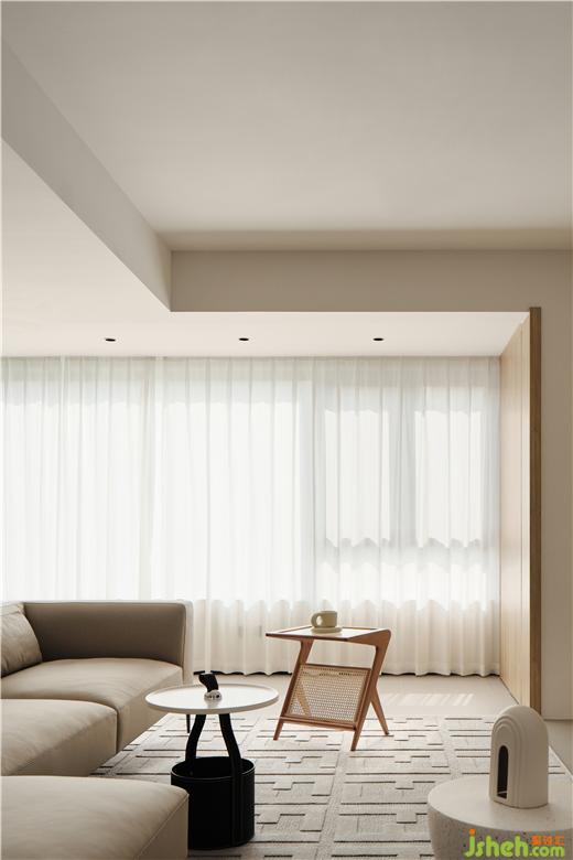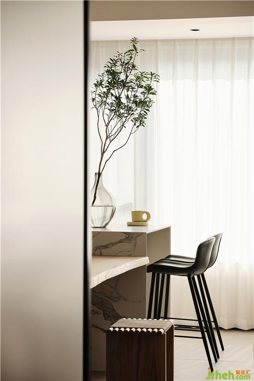 The composition of the large horizontal hall on the first floor spreads the living room, dining room and study flat, and the interaction between spaces becomes direct and clear. The furniture in log color matches the wall of milk coffee, showing the gentle expression of life. The dining room and the water bar are integrated. The vertical cabinet separates the dining room from the study. The white steel plate sculpture stands in the niche, making the dining environment blend into the tone of contemporary art.