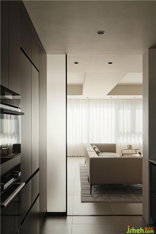 玄關(guān)、廚房、客衛(wèi)采用一字排列,極窄邊框玻璃移門(mén)實(shí)現(xiàn)空間的開(kāi)合轉(zhuǎn)換。鎮(zhèn)江豪宅設(shè)計(jì)移門(mén)軌道預(yù)埋到吊頂里面,力求空間的整齊干凈??托l(wèi)的洗漱區(qū)放置了一臺(tái)小型洗衣機(jī),臺(tái)盆對(duì)面墻是到頂?shù)南醋o(hù)用品陳列柜。干凈整潔的生活空間來(lái)源于充足合理的收納。