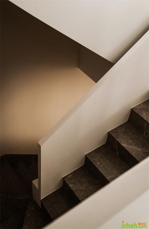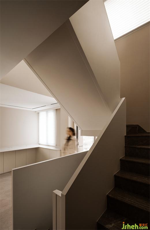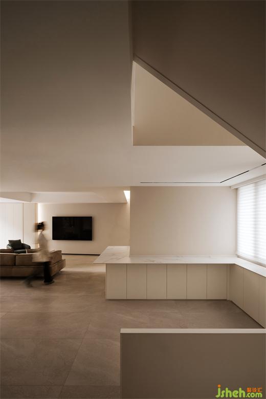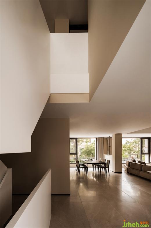 一層原來(lái)的陽(yáng)臺(tái)被拆除,合并進(jìn)客餐空間。大橫廳再次得到釋放。復(fù)式裝修設(shè)計(jì)保留下來(lái)的結(jié)構(gòu)柱被設(shè)計(jì)成了客餐廳之間的分隔,融合了餐邊柜的功能。