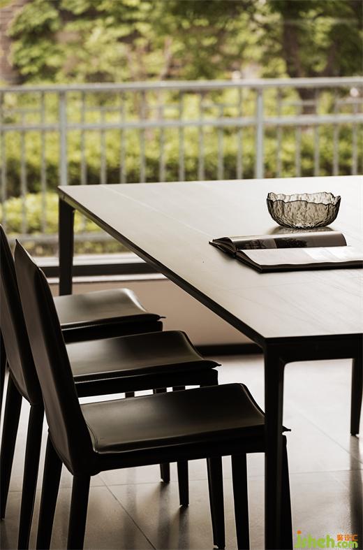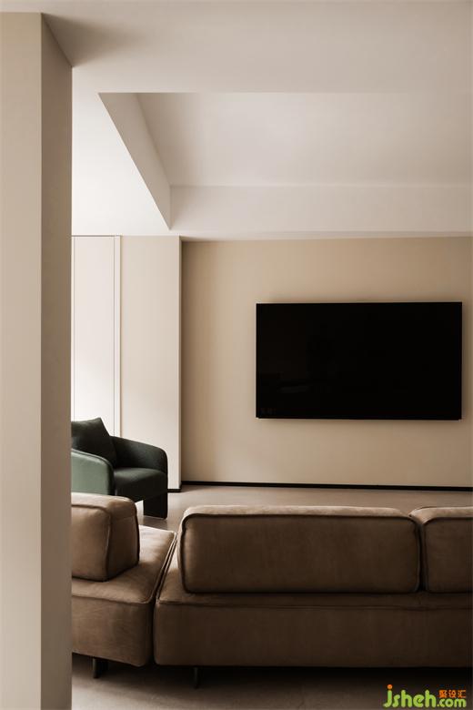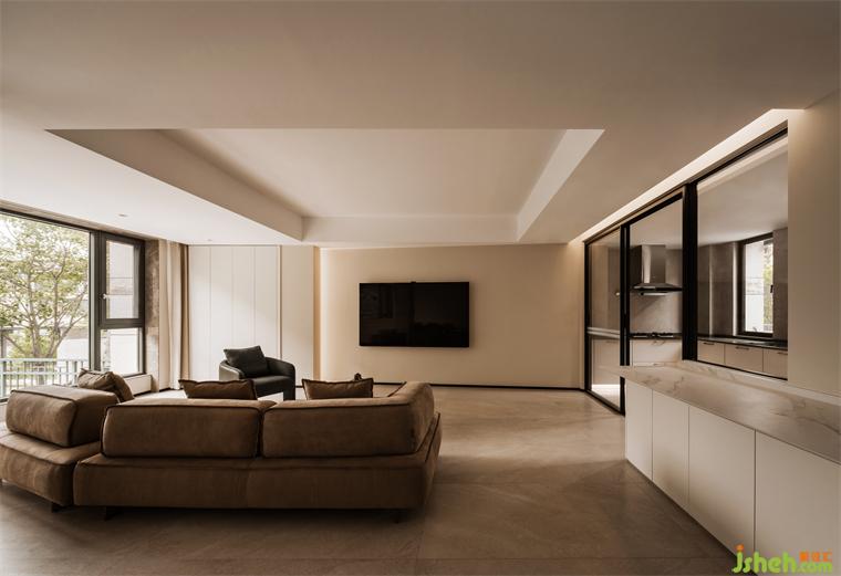 客廳的電視背景只用了一道斜面,每一處均用極少的設(shè)計語言來表達對生活的態(tài)度。廚房外面翻出的吧臺,很長,很白。雕刻空間的同時,又把功能做了極大的延伸。