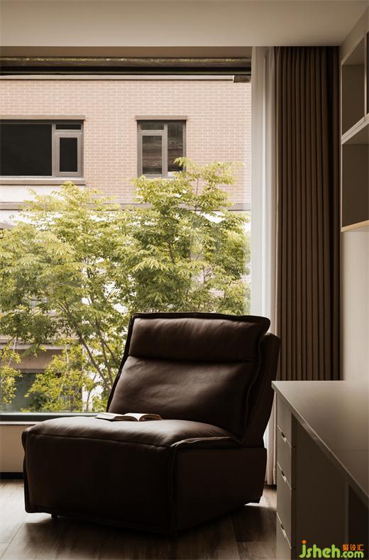 二層空間書房是中心,左右分別是女兒房與主臥。書房亦是藏書之所,定制了一條超長工作臺面。在家里,任先生使用的頻率較高,這里也是他開遠程工作會議的理想場所。書房與過道采用超大玻璃隔開,復(fù)式裝修設(shè)計通透的視覺保證房間空間的同時,過道亦不會擁擠。