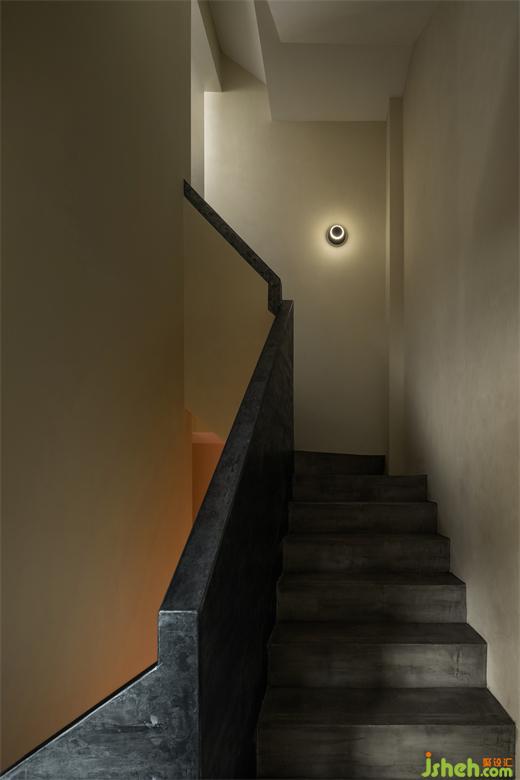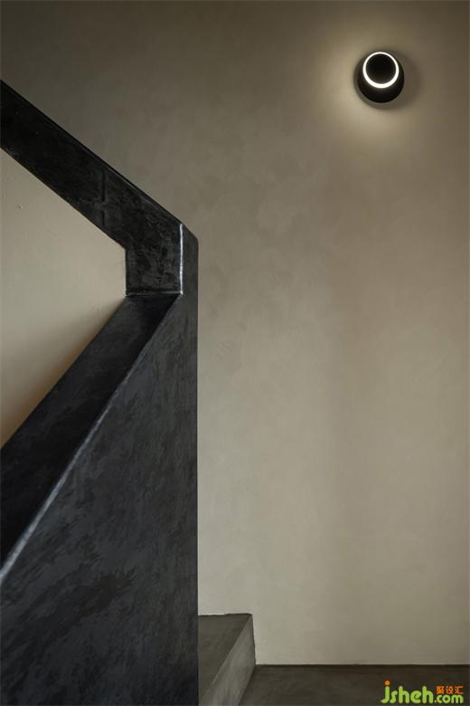 米白色的空間輕盈靈動,深灰色的臺階探出一角。展廳設(shè)計青云色的扶手,墨水紋的臺階,走在其上好似踏水行云一般。扶手與臺階面都選用了深色,拐角處的墻面安放了一盞圓形的小燈。