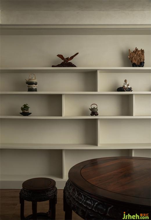 深色的中式家具與擺件,點綴在淺色的空間里,就像茫茫大海中露出的礁石。落座期間,如扁舟行于水間。煮茶對飲,四海皆友。