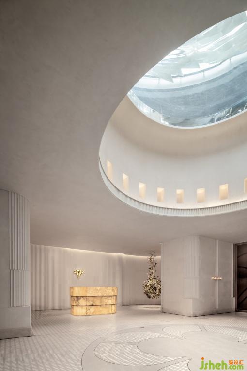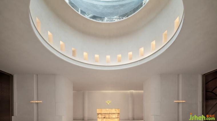 以方為基,嵌套圓頂構(gòu)建縱深,內(nèi)聚“向心力”;界面嚴謹圍合,墻面轉(zhuǎn)折柔和自帶規(guī)則豎紋肌理;玻璃穹頂傾瀉天光,仿若蒼穹之鏡——洗光趨柔,輕盈、柔和地灑落空間的每一寸區(qū)域。