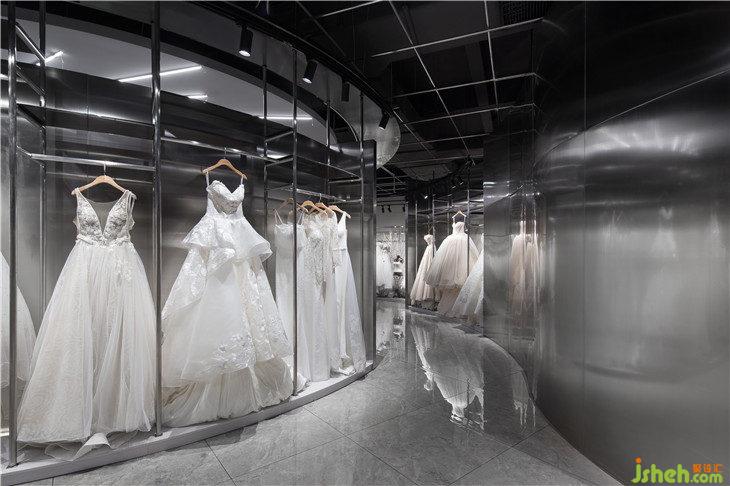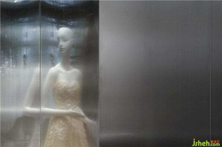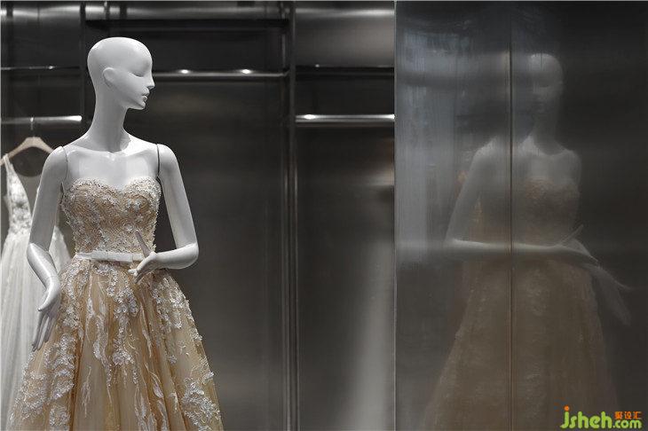 空間運用大量磨砂不銹鋼材質(zhì),以虛實手法大面積鋪設(shè)了主體背景墻。不銹鋼材質(zhì)本身的色澤和光感展現(xiàn)出了強烈的包容感,由于不同角度的光源照射以及光源本身的變化,映照在背景墻上的婚紗形狀與色調(diào)也會產(chǎn)生相應(yīng)變化,令人感覺如夢似幻。