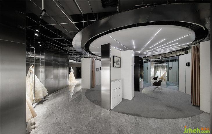 作為婚紗店最重要的區(qū)域,試衣區(qū)坐落在空間的正中央,成為視覺的焦點,這是為每位幸福的新娘打造的專屬自己與愛人欣賞的舞臺。環(huán)形的舞臺設(shè)計也解決了空間動線的問題,將挑選婚紗、化妝、試衣等不同功能的空間集中在一起,每個角落都得以充分利用。