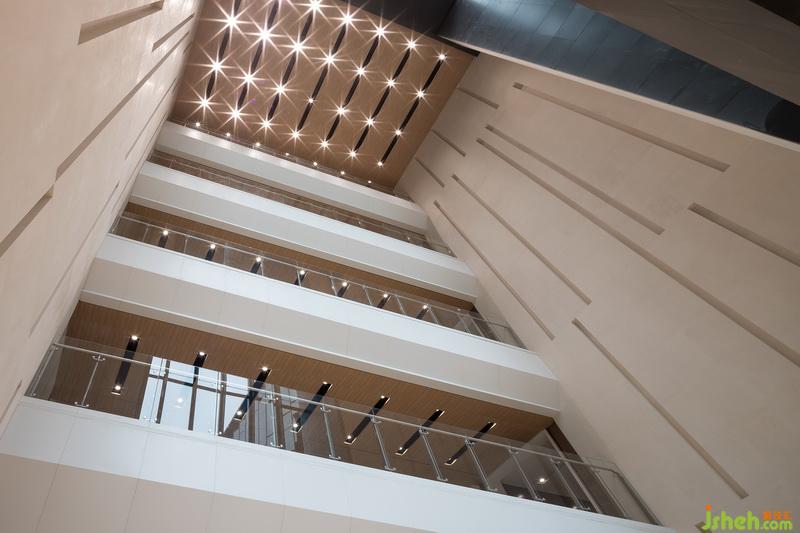 大堂運用金色與白色大理石等材質(zhì),以穩(wěn)重的風(fēng)格鮮明地展現(xiàn)了企業(yè)氣質(zhì),同時采用挑高設(shè)計并以豎向線條作為延伸,在天花板燈光的映襯下,整體空間顯得高聳而大氣。