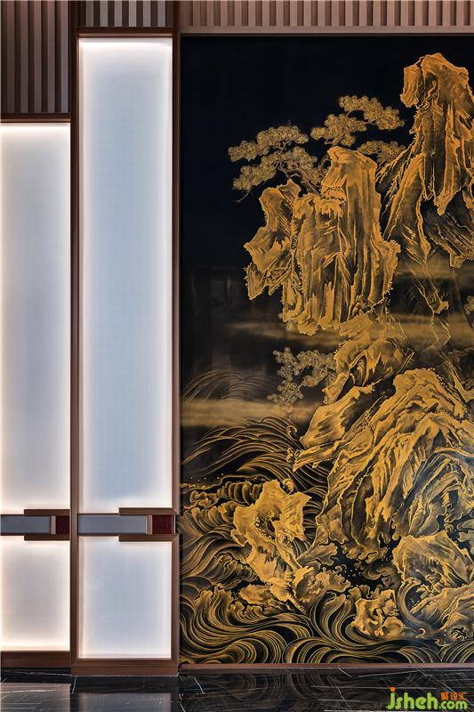 屏風(fēng)選取故宮藏品《秋山行旅圖》中峰巒疊嶂與松的結(jié)合再創(chuàng)作,使用“堆漆+描金”的工藝手法,將古典藝術(shù)的感染力融入沈陽的生命力。用漆灰堆起花紋后髹涂黑漆,打磨達(dá)到光亮后,用斗透明漆調(diào)和的彩漆在漆器面上薄描花紋,放入溫室待漆即將干燥時,著最細(xì)的金粉刷在花紋上。