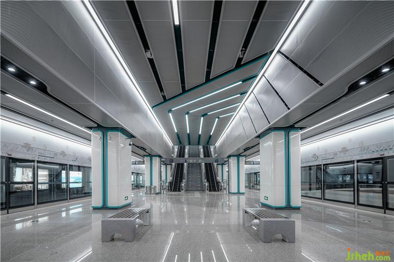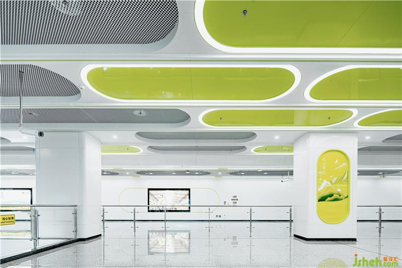 J&A 融合對天花、墻面、柱面、地面空間的整體構(gòu)思,營造出流暢、舒適的建筑裝飾藝術(shù)氛圍。藍(lán)綠兩色代表蔚藍(lán)天空與青草大地,孕育世間萬物,將自然與城市軌道交通相融合,體現(xiàn)蓉城人民的包容與豁達(dá)。