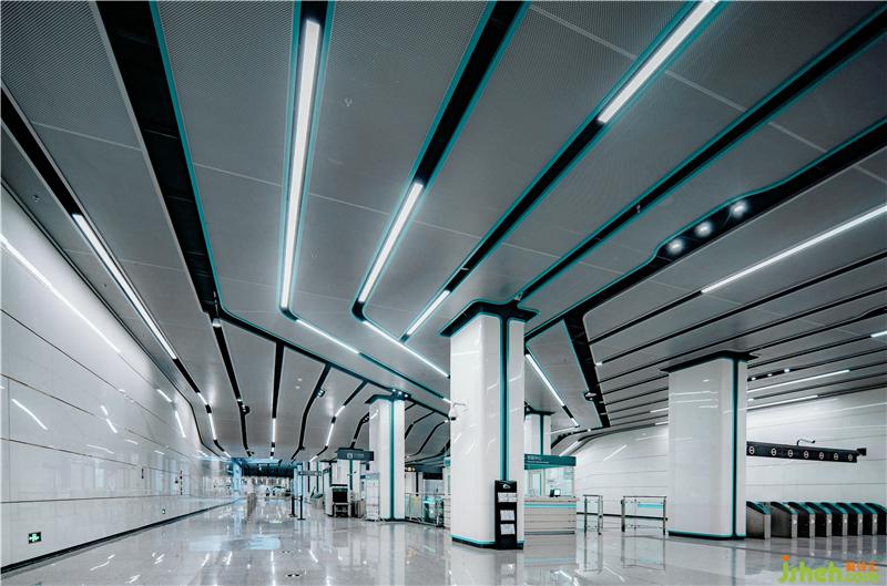 孵化園站以“科技創(chuàng)新”為設(shè)計(jì)主題,J&A 以“折線”三維元素將空間、線性燈具、綜合末端一體化設(shè)計(jì)。整體空間簡約大氣,富有科技未來感,契合“創(chuàng)業(yè)天府”的文化定位。