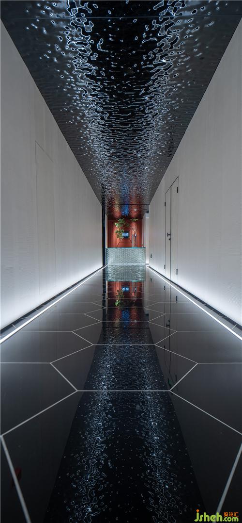 過道黑色六角形地磚以白色線條勾勒,水波紋不銹鋼頂面如波光粼粼的水面,縱深悠長(zhǎng)。