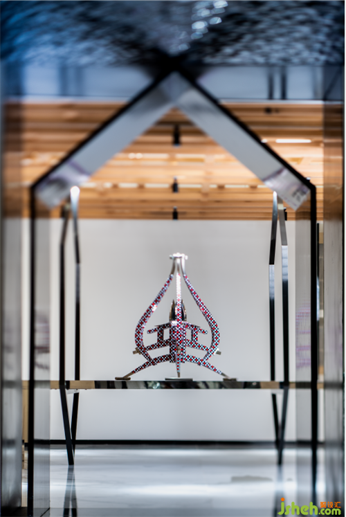 走道盡頭和展廳入口處是以莆田當(dāng)?shù)氐霓r(nóng)具—木犁為原型設(shè)計(jì)的藝術(shù)裝置,有傳承延續(xù)之意。水波紋不銹鋼吊頂營(yíng)造出水波意境,讓人忍不住駐足觀看。