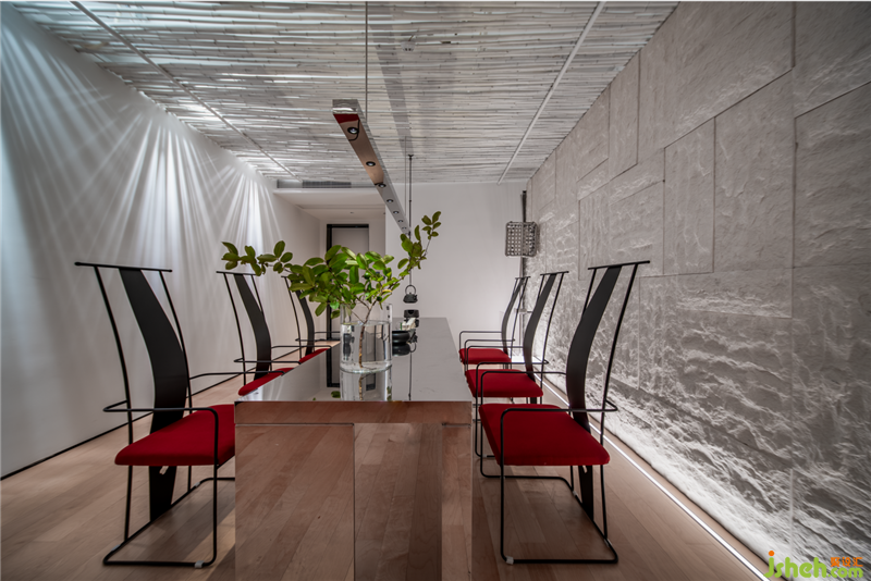 茶展廳:鋁方通頂面在鏡面不銹鋼桌面的反射下,與倒影產(chǎn)生一種奇妙的對(duì)話。呈矩陣排列、視野開闊通透的展廳,為匠心出品的茶具和上好茶葉提供充分的展示環(huán)境店鋪裝修設(shè)計(jì)。