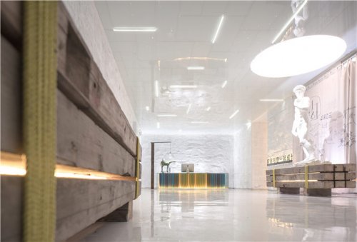 過道:黑色六角形地磚以白色線條勾勒,水波紋不銹鋼頂面如波光粼粼的水面,縱深悠長(zhǎng)。行走其中,有穿越時(shí)空之感。
