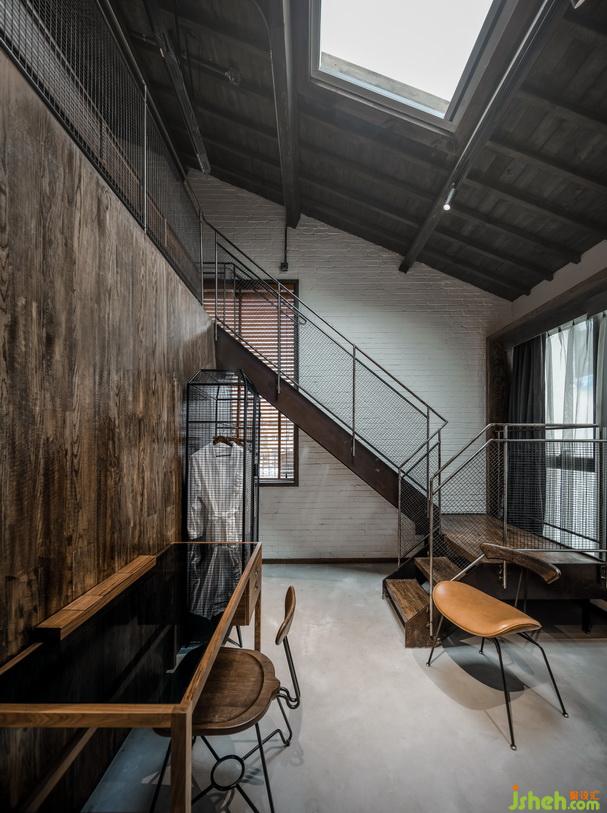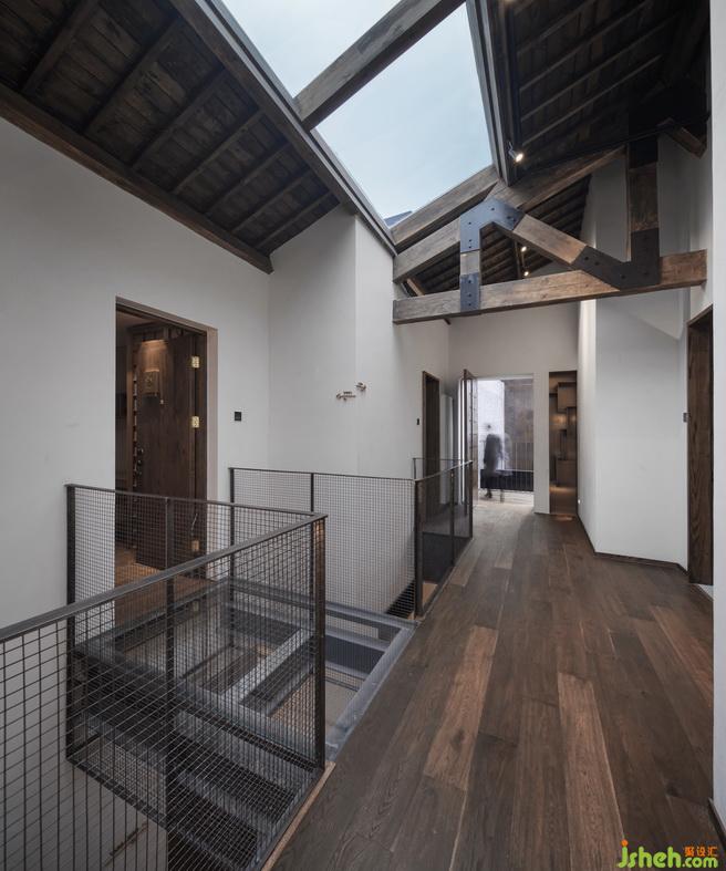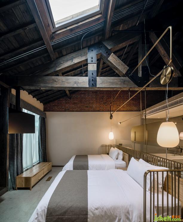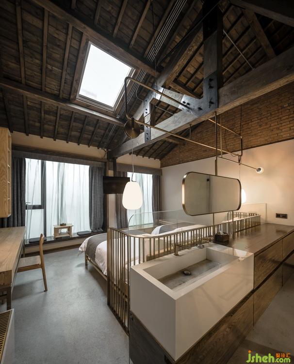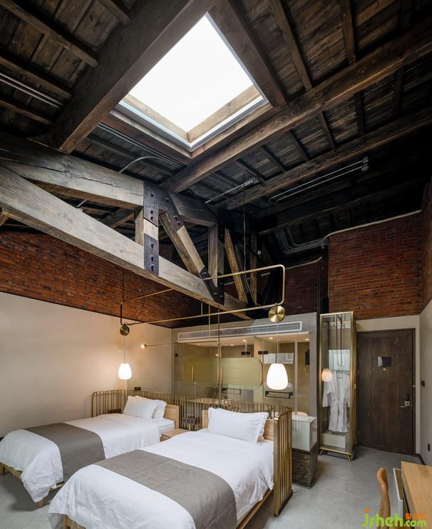民宿客房在朝南的主樓,樓內(nèi)空間功能分區(qū)布局巧妙,恰到好處。中庭,將樓道空間與露臺以及后院全部打通,達到視線與空間的最大程度的開放。玻璃天窗保證了客房公共區(qū)域的采光需求,一改老舊房屋的昏暗,銅質(zhì)和實木相結(jié)合的樓梯承上啟下。陽光照進天窗,輾轉(zhuǎn)映射在二樓白墻,透過挑空的中庭玻璃棧道照射到一樓水磨石地面,整個空間一氣呵成,顯得更加充沛明亮。