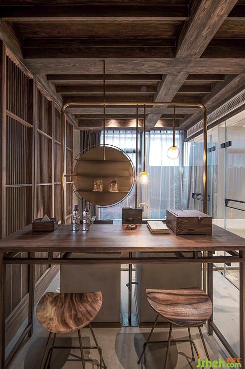 During the design process of neo-Chinese style, technique of simplification was employed to show the connotation of traditional Chinese culture. “Mirrors” in ancient times were made of bronze or iron. Designers in modern times like to combine copper that has not been over processed with round mirror plane. It takes one to create a life of quality. A place where simple dressing table meets big ceramic bathtub, wood meets iron, chunky bronze mirror meets glazed glass windows and modern facilities meet unique design, this is what Yu Hotel is all about.
