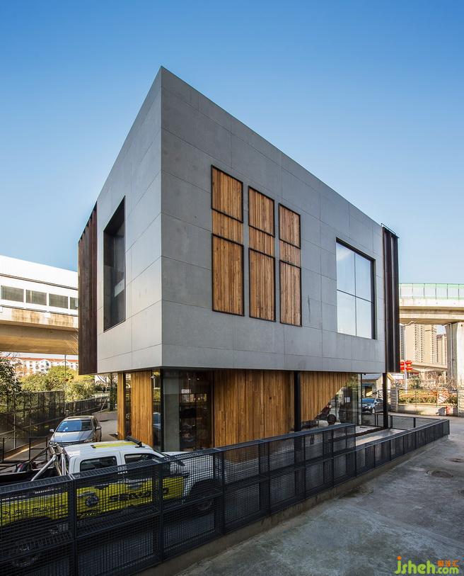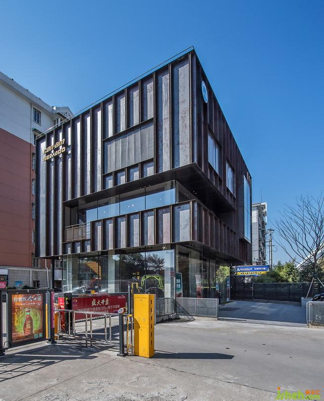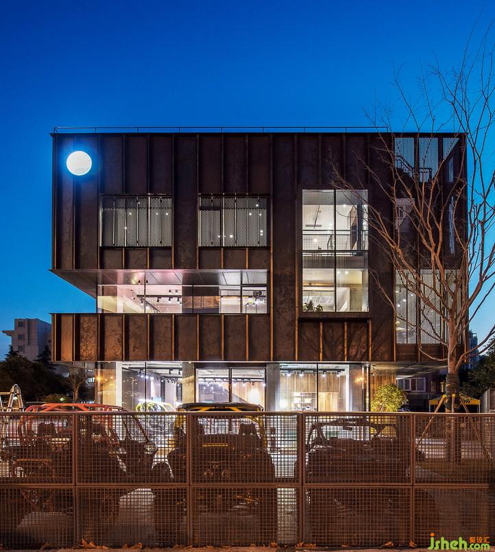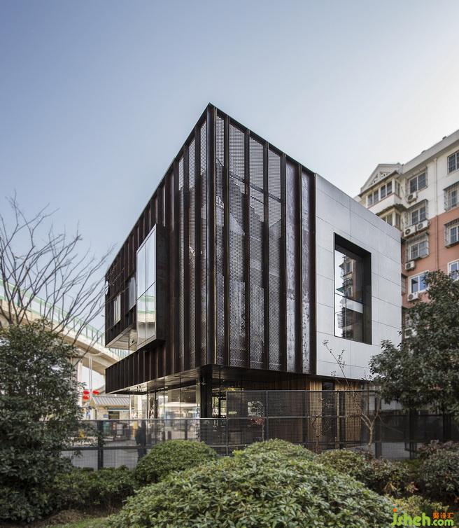 改造后的建筑,整體高度都拔高了。從遠處看象是一個站立的盒子,增加了視覺的沖擊力與趣味性??v向條狀的鋼板,配合朦朧感的沖孔鋼板與扎實的水泥板,簡單又直白,打破建筑原有的條條框框,從而表現(xiàn)出一種特別的空間虛實感,更加強了建筑的立體感。