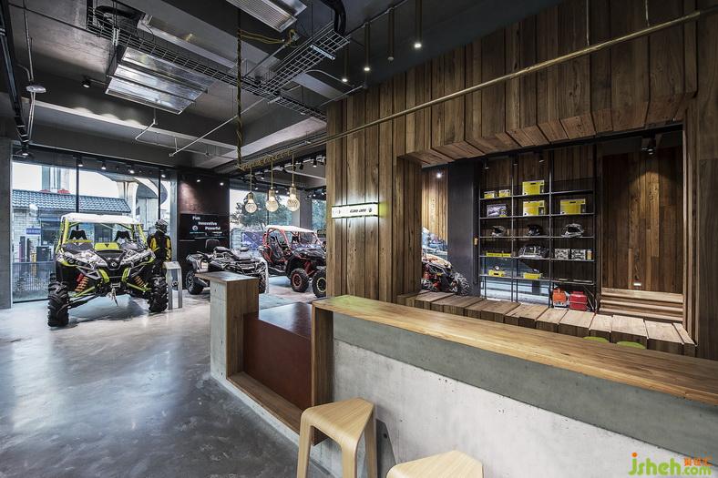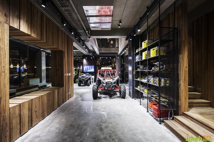 一樓和二樓是龐巴迪產(chǎn)品的展廳。設(shè)計師考慮到內(nèi)部的展示產(chǎn)品,所以在建材的使用上,選擇了清水混凝土與原木相結(jié)合,這種粗礦冷冽的重工業(yè)風(fēng),與倒三輪機車厚重如虎豹般的狂野氣息相呼應(yīng);再配合頂上金屬鋼管投下的射燈效果,把機車的質(zhì)感體現(xiàn)的淋漓盡致。
