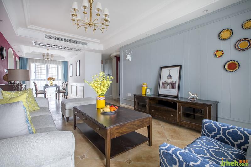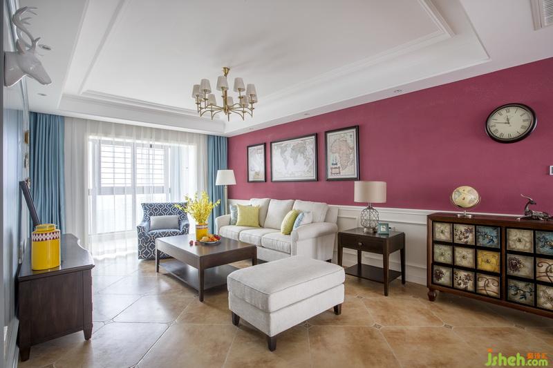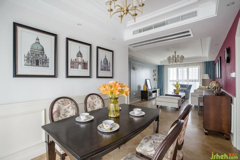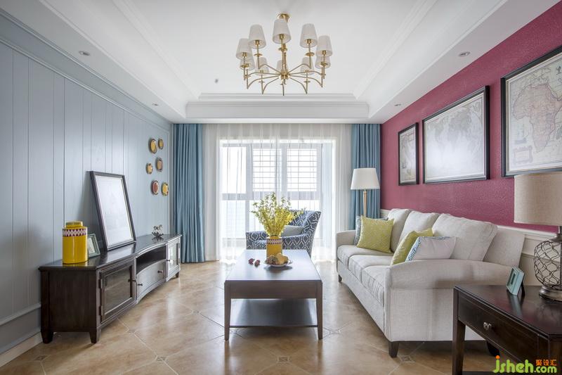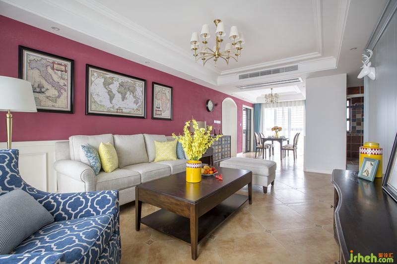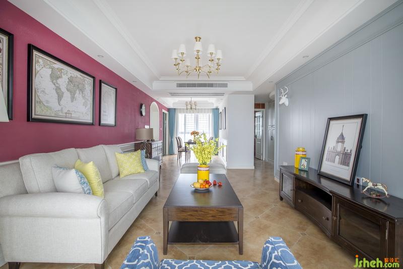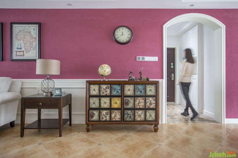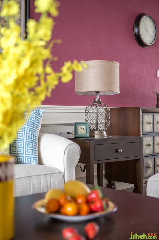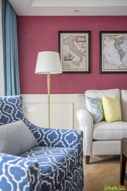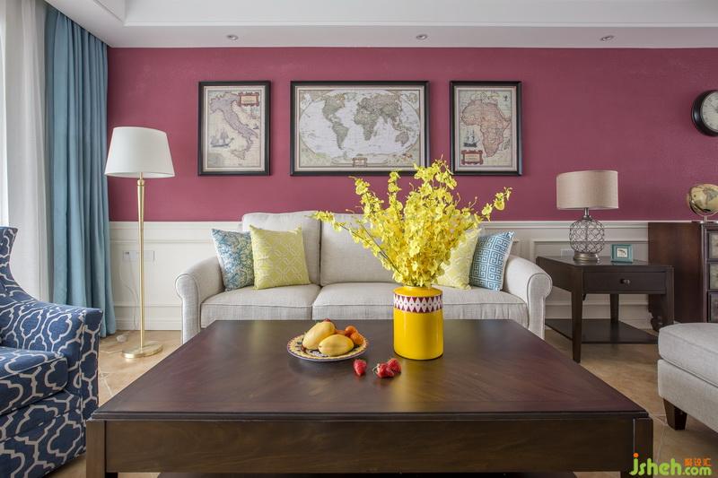 整個主題方面,業(yè)主希望的是有點不一樣的美式格調(diào),希望她是有質(zhì)感的,但是同樣又希望有一點特色,大膽的東西或者色彩融入家中。于是設(shè)計師便把充滿幻想的紫紅色作為主調(diào)作為沙發(fā)背景的背景色,再用其對比色藍色,降低其飽和度和明度作為電視背景的主色調(diào)。點綴以互補的黃色作為點綴色。整個空間不但新奇,而且活潑,大膽而又不壓抑。美式風(fēng)格本身以其桀驁不馴,隨意休閑為靈魂,而這套簡美的作品不光再色彩上大膽嘗試,而再選材上也是很講究的。用實木的胡桃木家具作為主題色,搭配布藝沙發(fā)與之形成舒適愜意的氛圍。用世界地圖、歐式古典建筑以及地球儀等飾品搭配,讓整個空間更具一種探索歷史的神秘感。追溯古典主義帶給我們的回憶,而又不忘古典和現(xiàn)代主義的交融,是這個空間的魅力所在。
