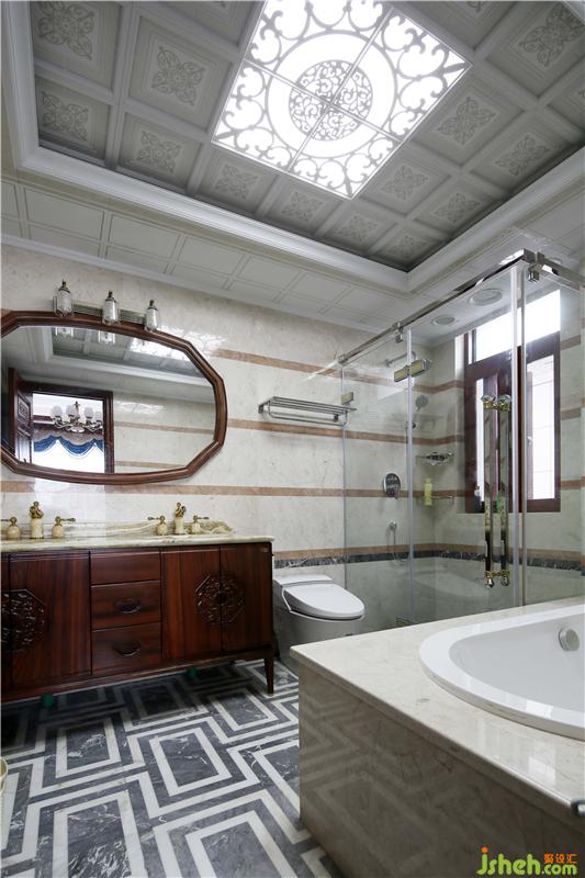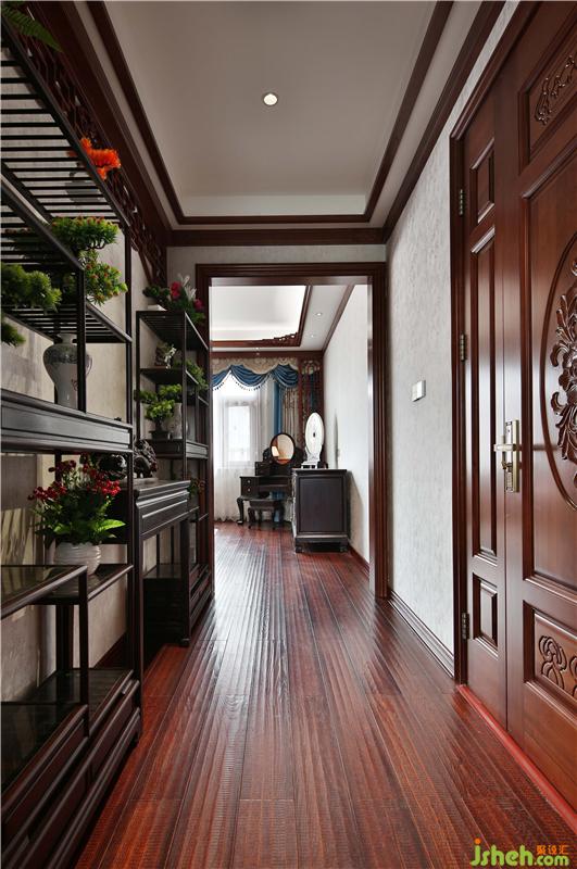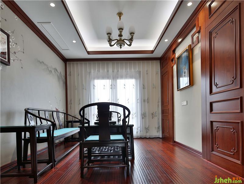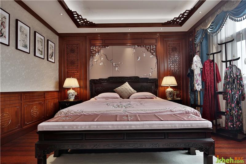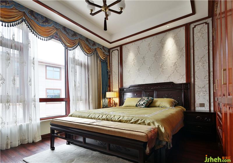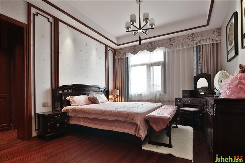 臥室選用新中式實木床,床頭裝飾燈昏黃的光線烘托溫馨的氛圍。簡約的山水瓷板畫,打破深色的厚重感,傳統(tǒng)與現(xiàn)代自由結(jié)合。別墅裝飾