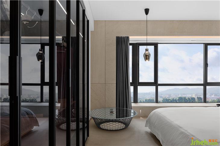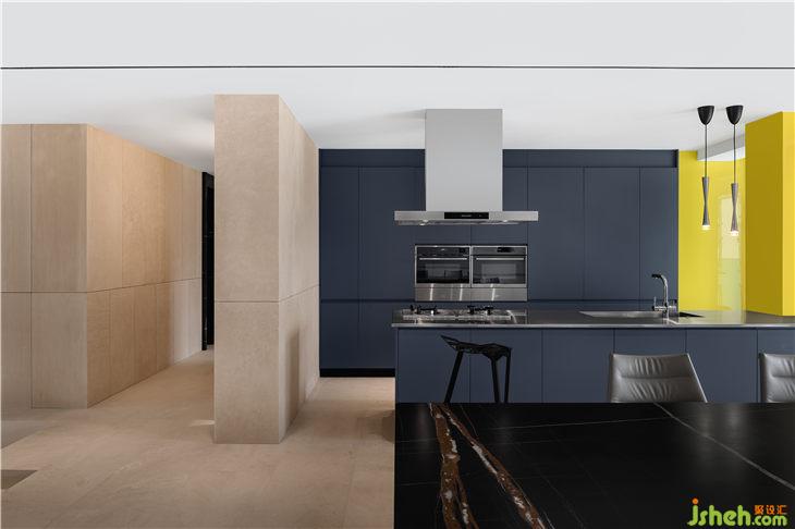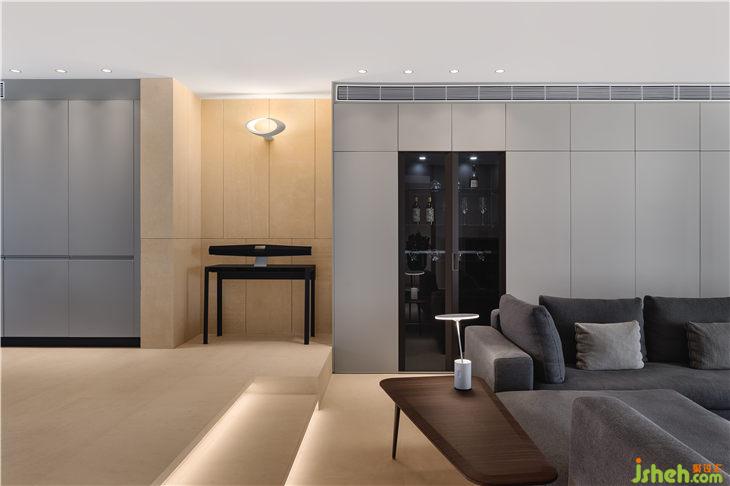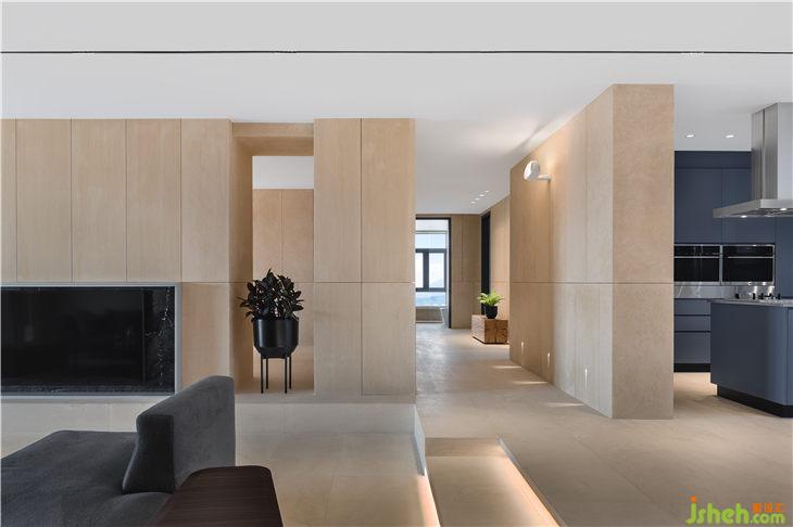 該住所沒有繁雜的裝飾,地面及墻面的材質(zhì)幾乎是單純的一種,源自于法國的大理石,通過削光及紋路淺露的方式,保持石材天然的質(zhì)感,讓簡潔更富有細膩及表情。