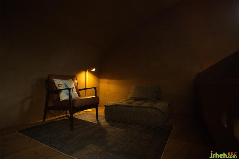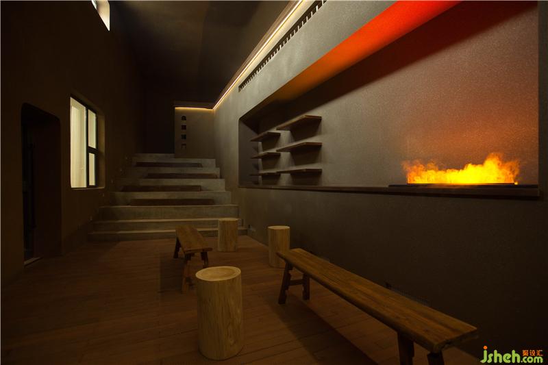 同時,我們在整個建筑空間中,設(shè)置了一處蒸汽壁爐,壁爐的火焰給人以溫暖的感受,這是人的天性,我們愿意聚攏與火堆,盤腿而坐,細(xì)細(xì)攀談。但這不是我們的唯一目的,榆林窟的天氣是極為干燥的,這雖然為壁畫藝術(shù)品的保存創(chuàng)造了得天獨(dú)厚的條件,卻對人的生活是極不友善,于是,我們希望通過蒸汽霧化功能,增加空間里的濕度,給人們一個更加舒適的環(huán)境。而對于空調(diào)的考慮,我們也是極為巧妙的把它隱藏在了空間的夾角里,這不僅節(jié)約了空間的使用率,保證了層高的最大化,也讓這個空間顯得更加的純粹,這無疑是讓空間更加友善的一種極好的方法。