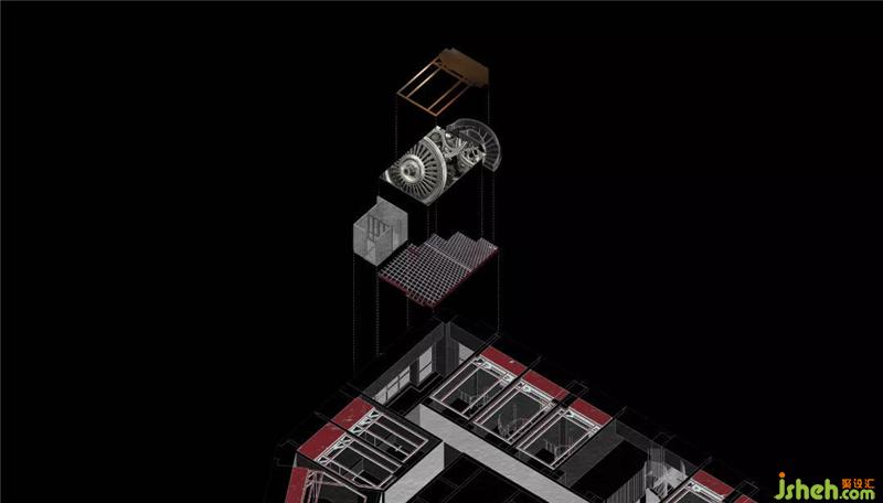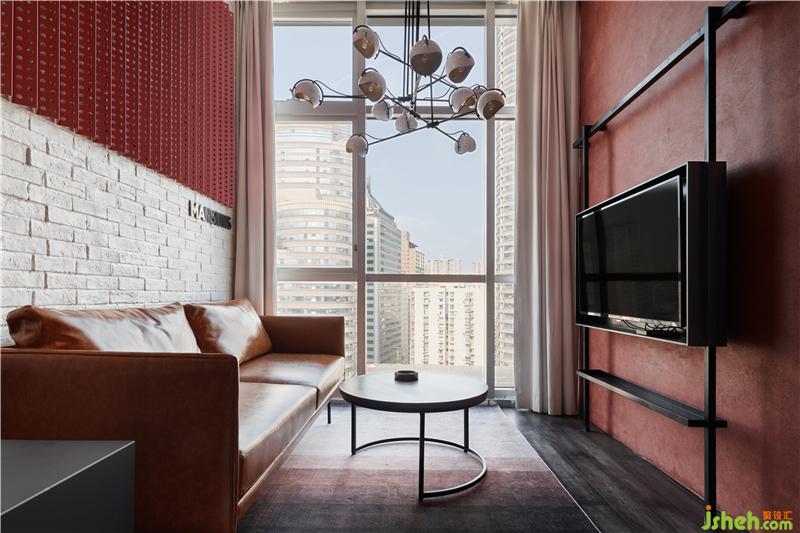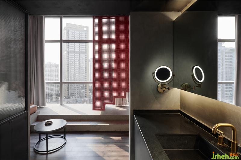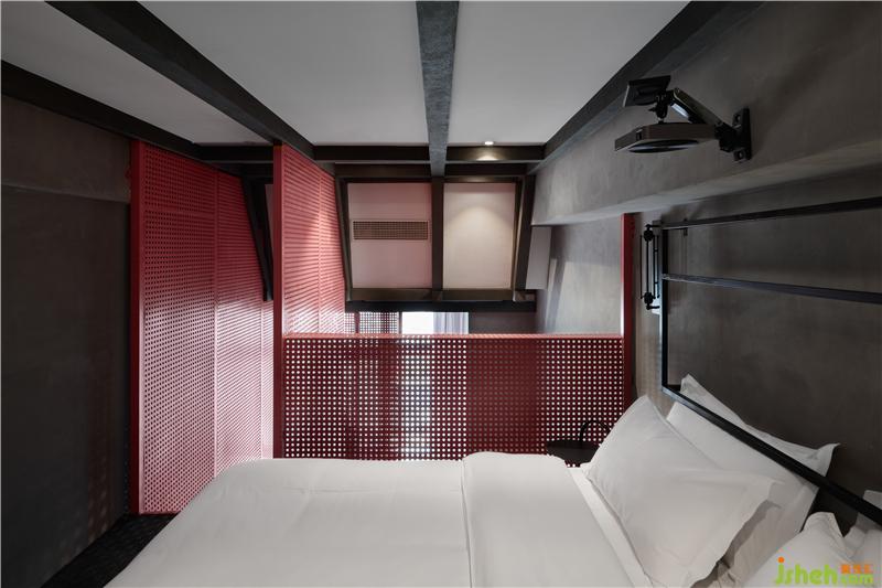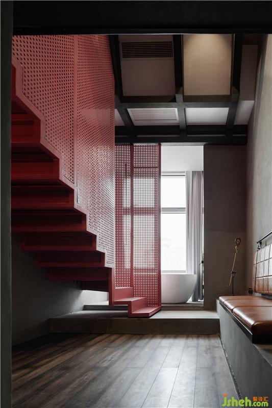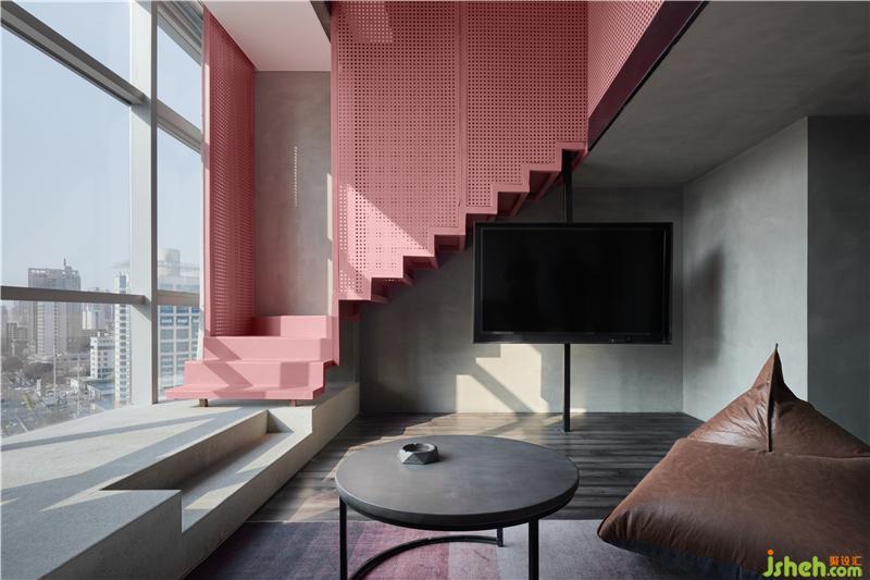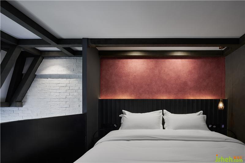 所以我們利用高挑的層高關(guān)系把整個空間上下一分為二,這不僅有效的利用了空間的使用率,酒店設(shè)計也從功能分區(qū)上進(jìn)行了動靜關(guān)系的思考;一層空間便承擔(dān)起了公共區(qū)域的作用,客廳、衛(wèi)生間、儲藏空間被放置其中。這亦是一個動態(tài)的空間,我們運用工廠固有的一些符號,不斷強(qiáng)化著我們的視覺主題,體驗感在進(jìn)入房間的第一刻便鋪面而來。