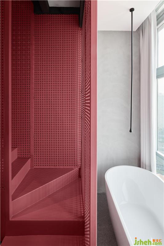 二層作為居住空間,更多的考慮來自于舒適性與便利性的思考。豐富的燈光形式與地毯的設(shè)置,都是在弱化鋼材所帶來的冰冷感,而暗紅色的藝術(shù)涂料,不僅能增添空間的層次感跟包裹感,亦能產(chǎn)生些許的溫暖感受。每一個房間我們都在睡眠空間相關(guān)的區(qū)域設(shè)置了便于掛取的衣帽設(shè)備,而在空間較為充足的房間里,我們均設(shè)置了上下兩處清潔衛(wèi)生空間,以此來滿足更為便利的生活功能使用,帶來更為舒適的居住體驗。