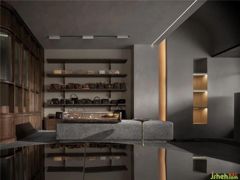 Therefore, while keeping the space interesting, the sense of quality needs to be guaranteed. Attract people in and sit down. The space in front of the door is such logic of thinking, friendly spatial relationship, let the passerby have the desire to walk in. Then, the corridor(hallway), do not decorate too many products. This is to create a sense of mystery. And this kind of construction, only let you be full of curiosity further. The raised platform ensures the level and interest of the space, and sets the main product display area at the platform location.The position of the luxury bags cater to the consumers' psychology. After an elevated display area, the sunken space is divided into three components.The innermost space is for office and storage functions.The area on the right is the bar and goods maintenance area, full of ritual sense, indicating the former glory of these famous products from Europe.Opposite the bar is a spacious and comfortable leisure tasting area.