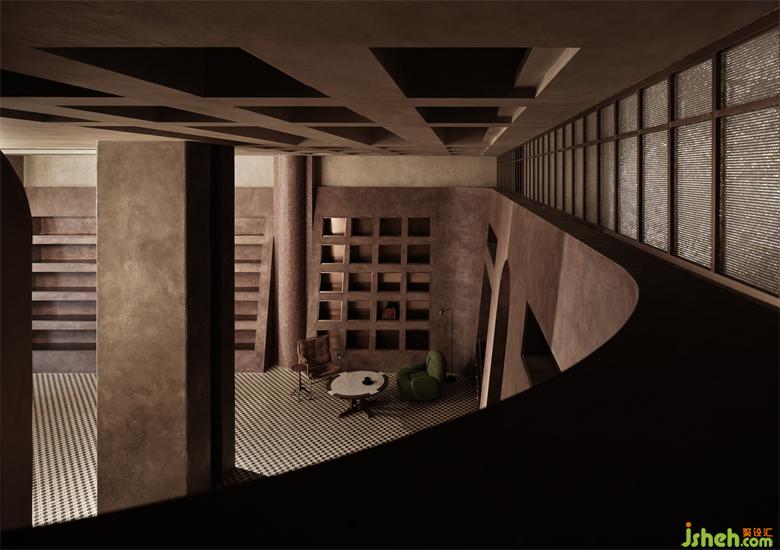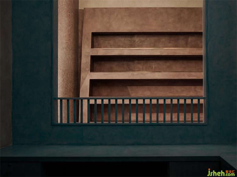 Walking further inside is the spiritual field that we can build. The story height relationship that could have been built as a two-story space has been preserved. Here, tall structural columns and luggage display walls have become the main body of vision. The low-lying seating area is in sharp contrast with it. And this contrast is exactly what we want to create. It is highly related to the posture of Chongqing. Exaggerated stair entrance and modeling doors and windows imply there still contain the mysterious area we can explore.