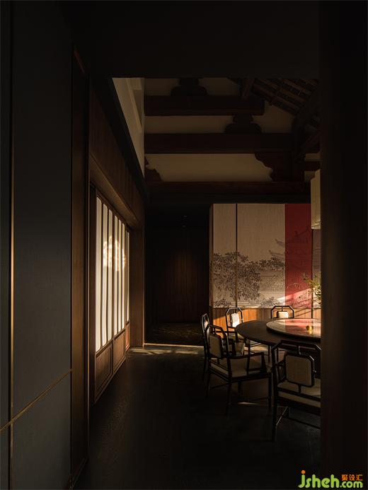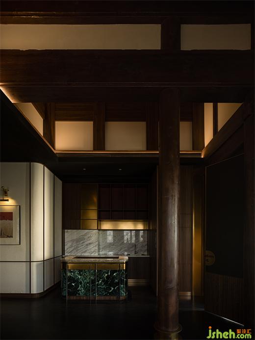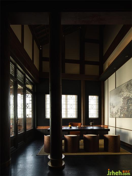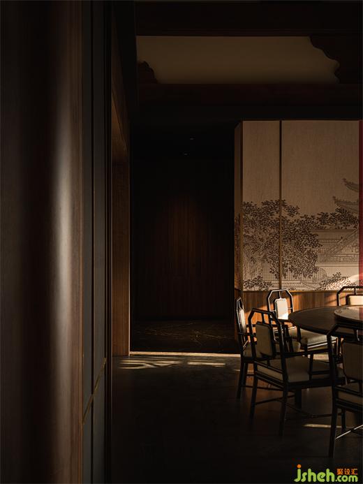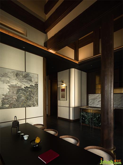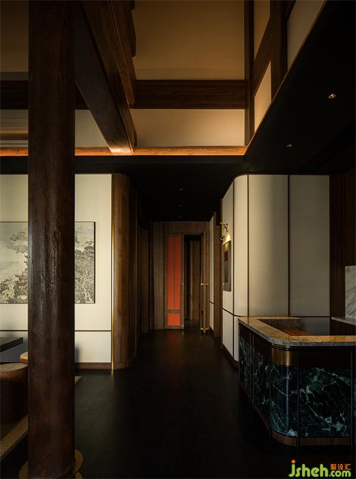 所以,在有限的建筑空間關(guān)系里,結(jié)合非對(duì)外經(jīng)營的功能屬性。我們舍棄了在傳統(tǒng)酒店業(yè)態(tài)里所必須的前臺(tái)接待及入住辦理功能。而是將原本應(yīng)作為接待功能的空間區(qū)域,演變成為了兼顧服務(wù)、咨詢?cè)趦?nèi)的公共開放活動(dòng)空間。非遺會(huì)館設(shè)計(jì)以此方式,解決了酒店入住配套應(yīng)有的餐食、品茗、棋牌、KTV娛樂等附加功能。
