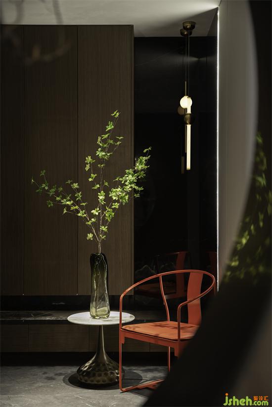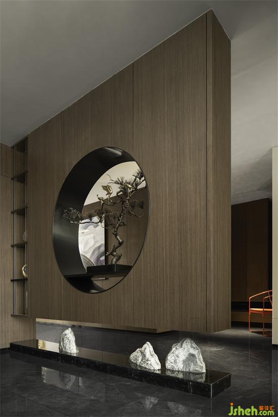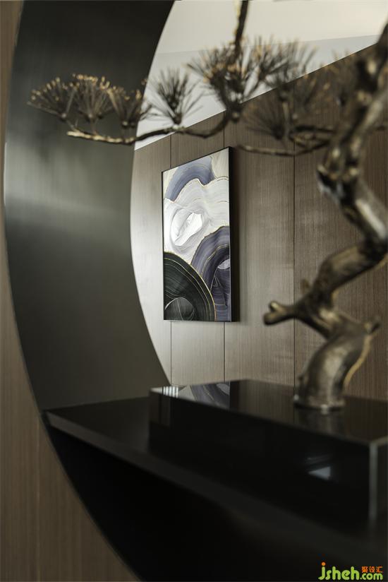 玄關(guān)從細(xì)節(jié)處著墨,讓藝術(shù)融入真我。住宅設(shè)計(jì)用藝術(shù)畫、山石和綠植等元素彰顯主人的審美品味。