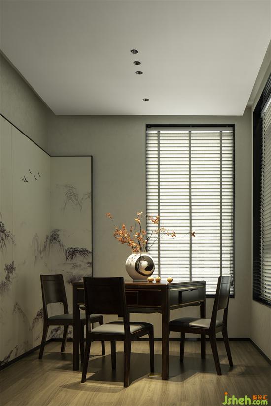 棋牌室的設(shè)計(jì)深諳居住者的娛樂愛好和審美意趣在滿足功能需求的基礎(chǔ)上用詩(shī)意詮釋了別具一格的藝術(shù)品味中式風(fēng)格棋牌桌、山水畫屏風(fēng)一簇紅葉生于水墨之間為空間增加了奢雅、舒適、美學(xué)的專屬特性