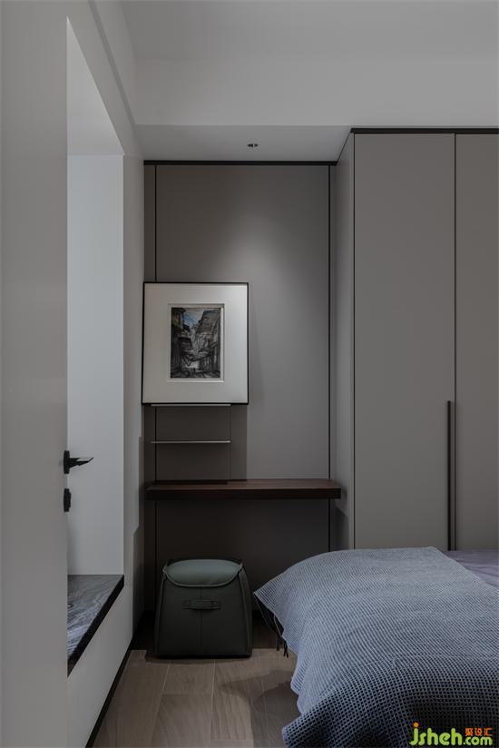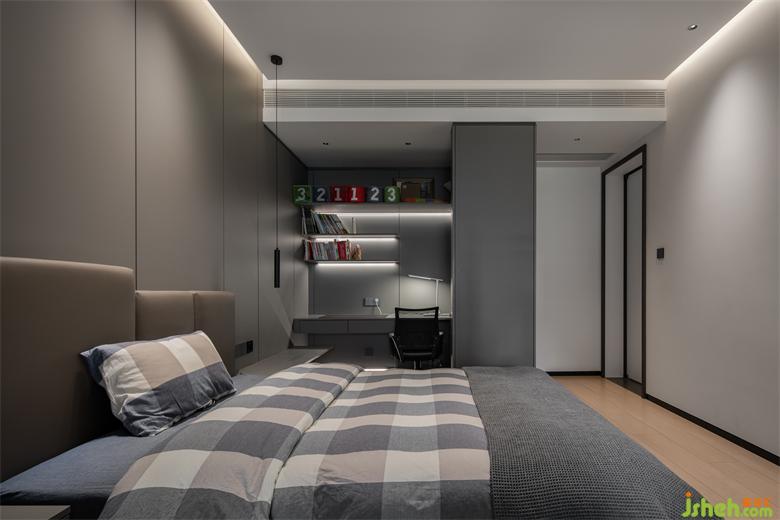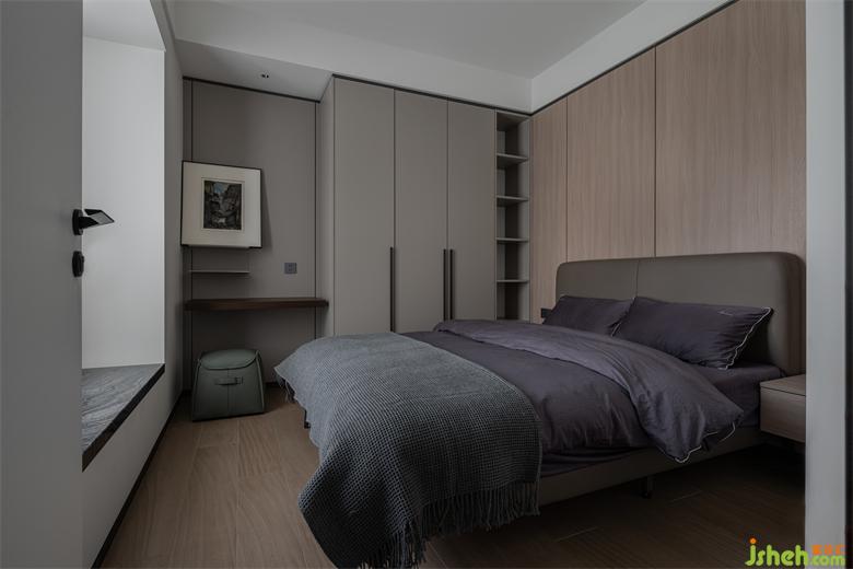 次臥用灰色與木色墻板相結(jié)合,麗雅龍城住宅設(shè)計打造豐富的視覺效果。漸進(jìn)的層次、素雅的配色,都在為整個空間增添生活本源。