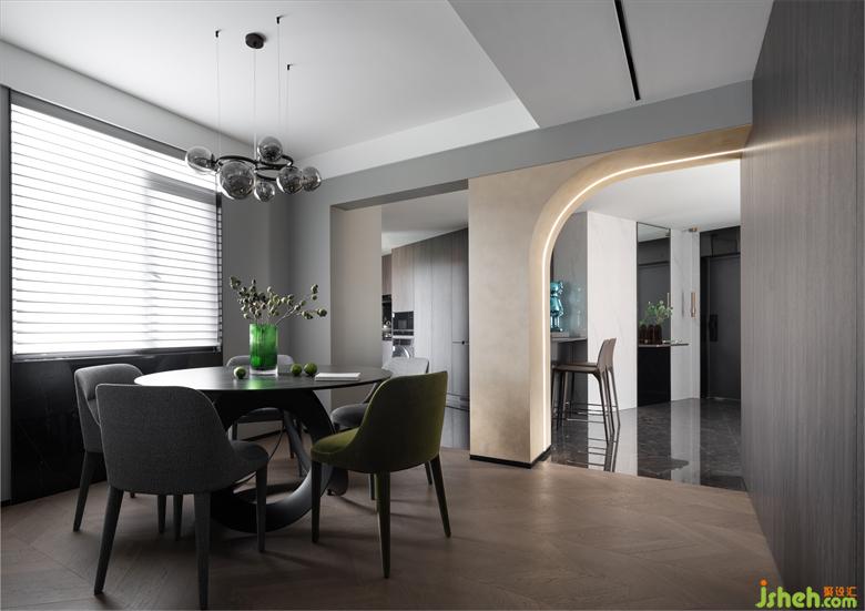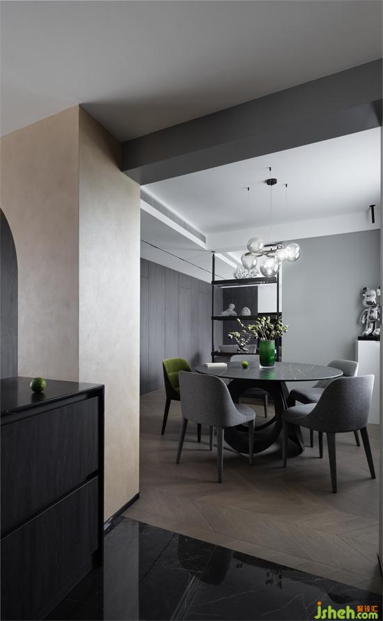 戶型較深的走廊讓客餐廳空間布局成為設計的重點,鑫嘉園家居設計以開放式餐廳來打破沉悶、狹長的過道,通過材質(zhì)與顏色來過渡,劃分出清晰的功能區(qū)域,開放、包容且有序。