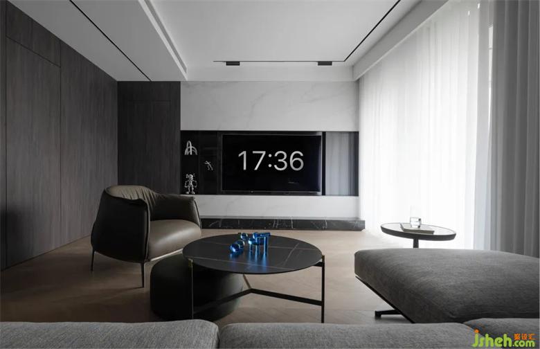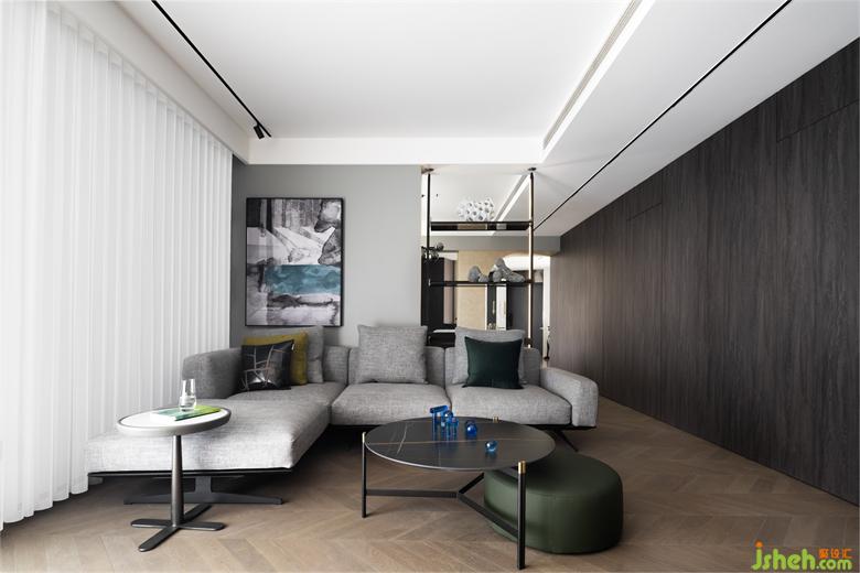 過道一側的滿墻深木色護板與隱形門將臥室區(qū)域全部隱藏,大面積深木色塊奠定了客廳的基調(diào)。鑫嘉園家居設計安靜和放松是這個空間的主要功能,學習、玩耍、觀影都可以是這里的主旋律。