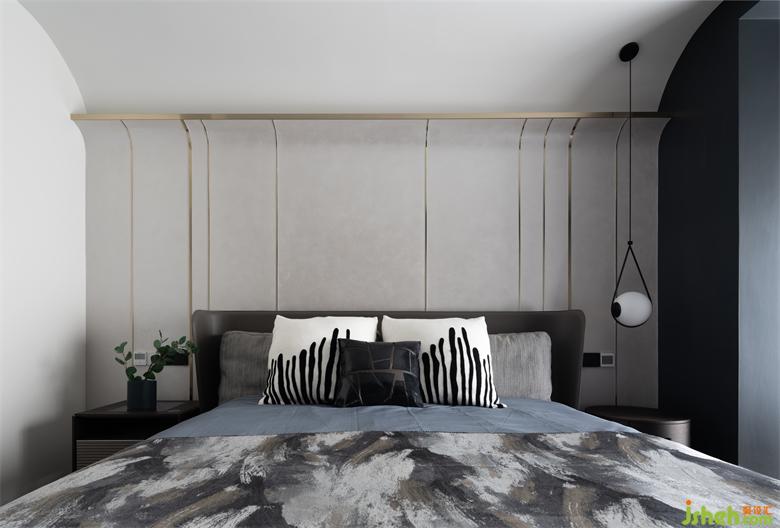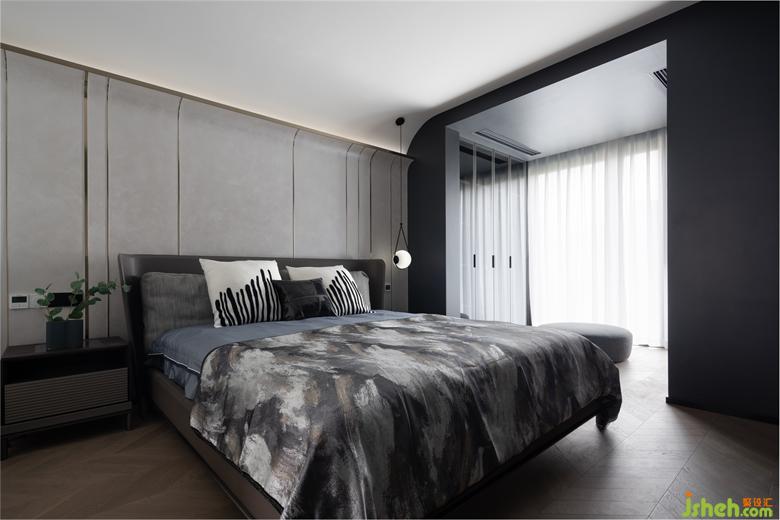 主臥隱藏在電視墻后面,仿似世外桃源,別有洞天?;貞酥魅讼胍氖孢m放松需求,將陽臺納入改成衣帽間,把原有衣帽間和衛(wèi)生間打通成一體,呈現(xiàn)出一個配套齊全的休息區(qū),讓原本緊湊的空間通透有調(diào)性,也滿足了各種功能需求以及精神享受。