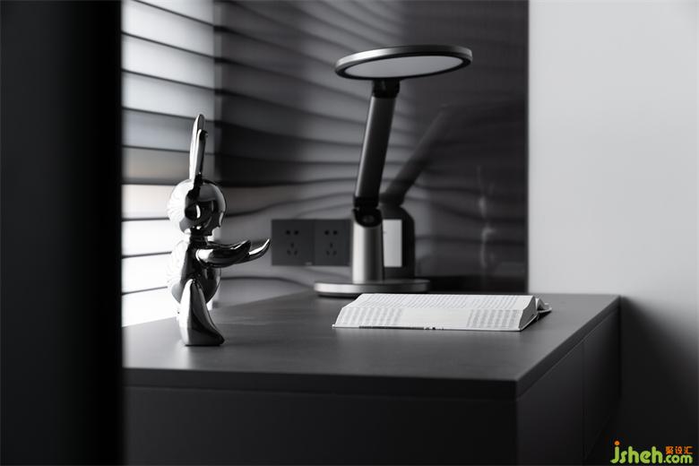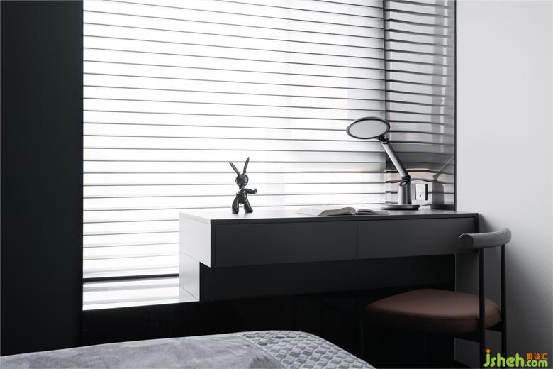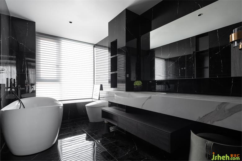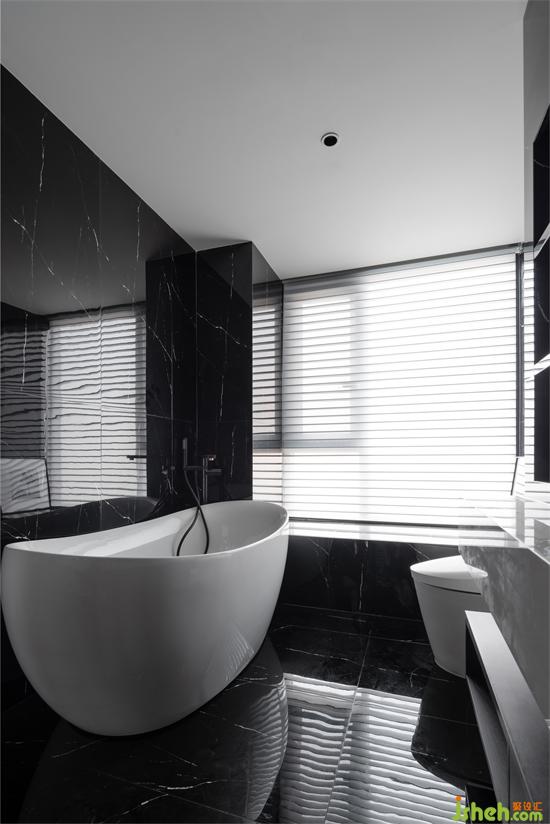 主衛(wèi)在黑白灰的色調(diào)中顯得尤為現(xiàn)代,窗前放置橢圓形浴缸,巧妙的柔化了空間,浪漫、藝術(shù)、個性,靜默中亦有生活的從容啟示。