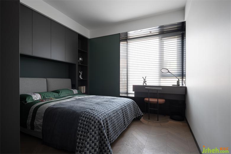 采用沉靜的暗綠色來為兒子房增加趣味性與藝術(shù)性,床頭兩側(cè)做壁龕用來收納、展示小主人的收藏品。鑫嘉園家居設(shè)計(jì)利用飄窗的位置配備了單獨(dú)的學(xué)習(xí)區(qū)域,在房間中采光最好的地方品讀書香,少年的活力,青澀與成熟之間的探索,在綠茵森語中漫游,演繹著自信自由的內(nèi)心追求。