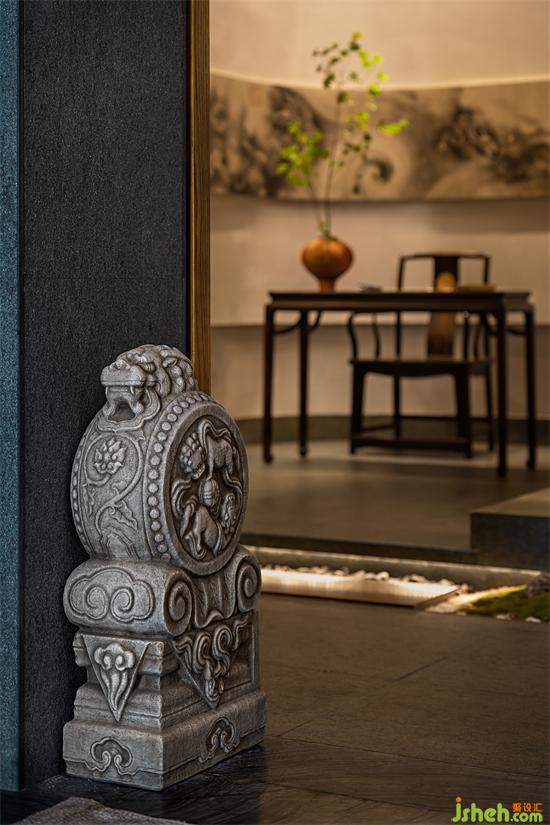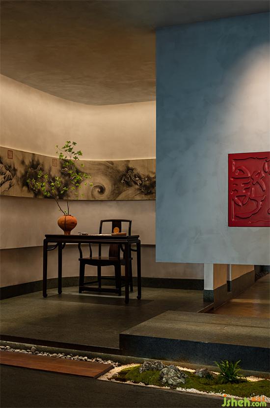 The courtyard’s dry terrain is made up of sand and bluestones that are distributed among the shadows cast by bamboo and pine trees. The Southern Song Dynasty painter Chen Rong’s lengthy book Kowloon Map is illuminated by light that filters through the pine branches and casts a beautiful hue on the wooden walls that resemble paper made in Tang dynasty. The majestic movement of“steaming clouds, flying rain, descending sky, and broad sea”in Kowloon Map transcends the intention and expands the connotation and depth of space, thus evoking historical and spiritual resonance.