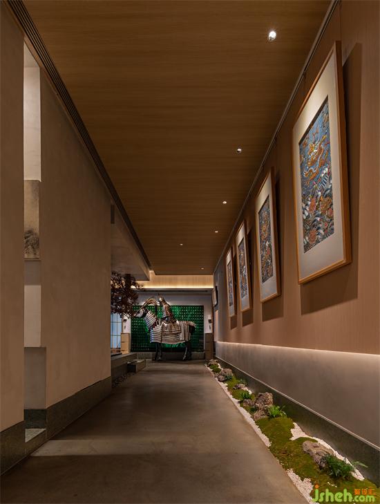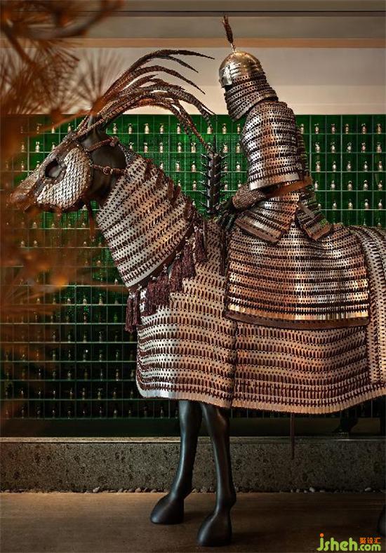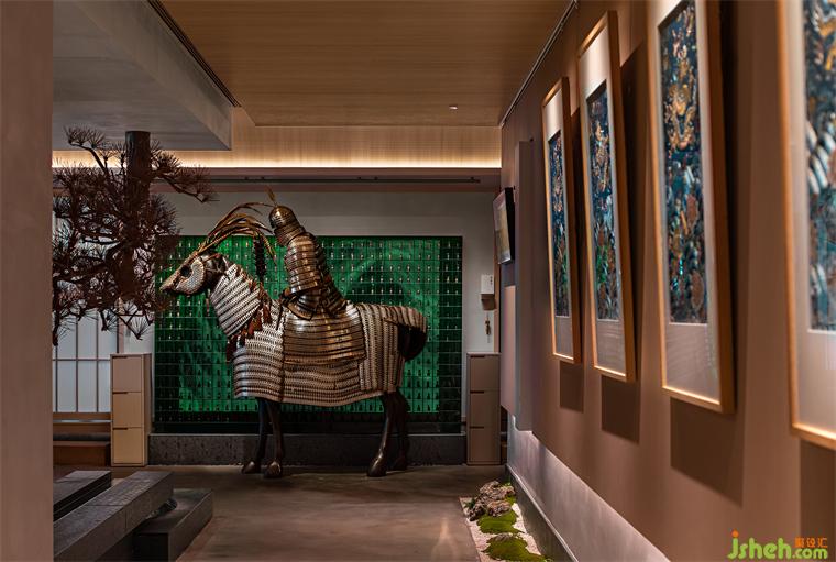 不止于空庭獨酌的風(fēng)雅,把杯歡歌的疏狂亦是設(shè)計師想要賦予空間的屬性。深圳晴舒料理設(shè)計師在餐廳中加入“鐵浮屠、時光寶鎧”等元素,兵器、甲胄等意象的融入,中和了和式風(fēng)格千篇一律的內(nèi)斂與緘默,塑造出騎兵凱旋、同飲共慶的場景感,將干云豪氣糅合于空間氣質(zhì)之中。