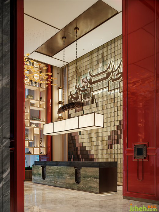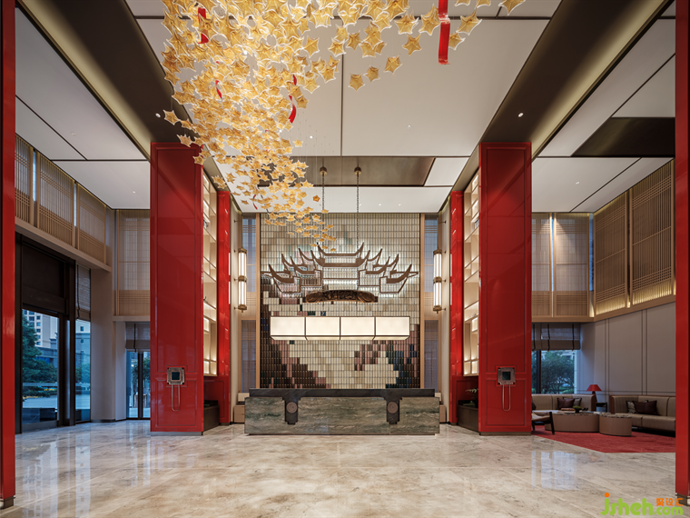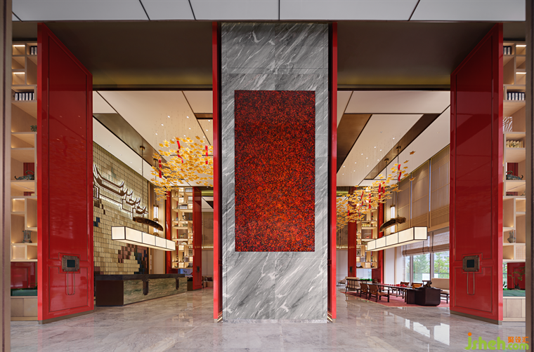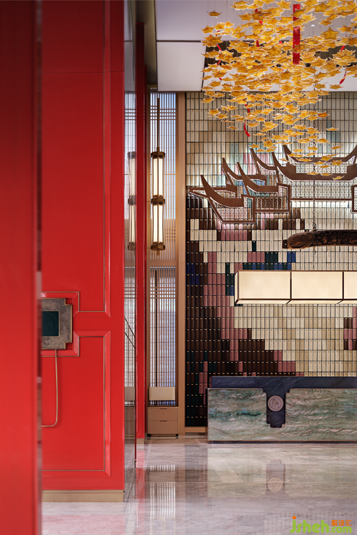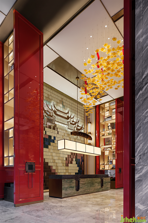 “東風(fēng)夜放花千樹(shù),更吹落,星如雨”,踏入大堂,即可自設(shè)計(jì)語(yǔ)言中感受“火樹(shù)銀花不夜天”的盛大場(chǎng)景,正紅立柱如朱門(mén)開(kāi)敞,以古典禮儀展示迎賓納福之姿??臻g中央以大理段式通用貝幣為景觀賦形,將段氏文化融鑄于空間的骨骼脈絡(luò)之中,于一物一景間氤氳氏族情懷,一磚一木中匯集文人雅韻。