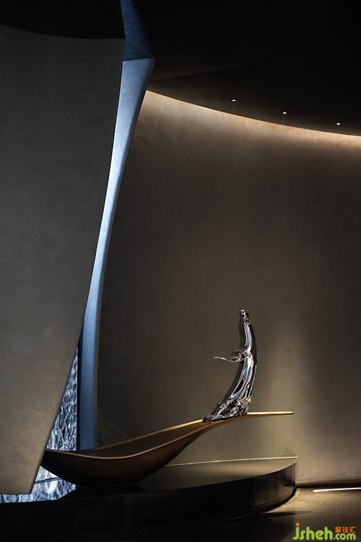 “兩岸猿聲啼不住,輕舟已過萬重山”,設(shè)計師將詩詞意韻揉碎在設(shè)計之間,向上延展的流線立柱如同寫意筆法,在空間中留下流光溢彩的畫跡;獨立舟頭的文人形象恰如隱逸山間的仙者,自空谷中超然獨立。 沿溪谷而行,尋綠苔深入,一次飲食體驗被設(shè)計暈染為游園漫旅,空間氛圍分外舒朗風雅,別有意興。