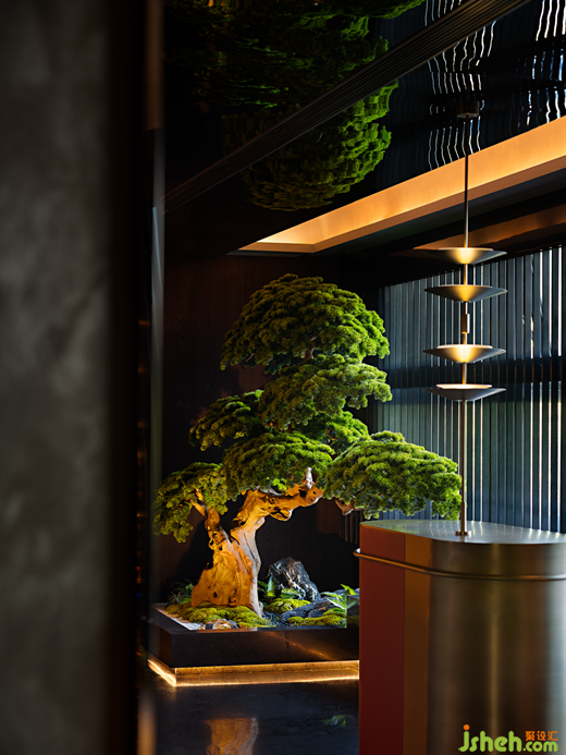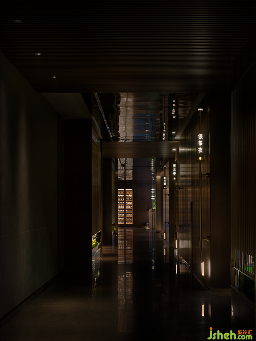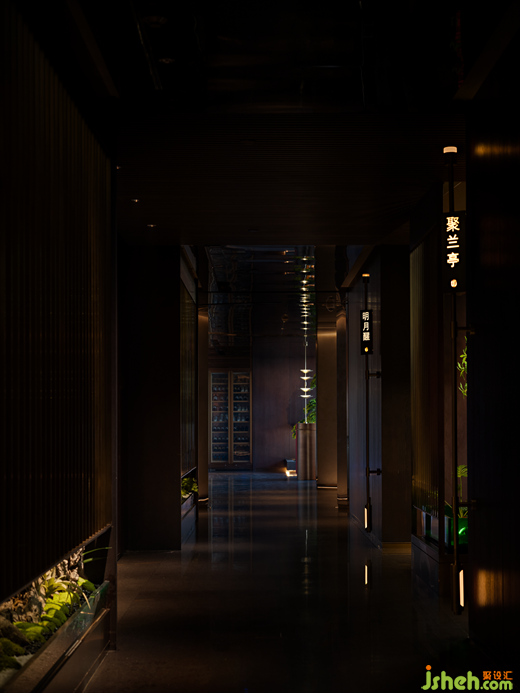為了與室內(nèi)形成鮮明視覺反差,大堂與走廊部分摒棄了刻板的繁復照明,而是將空間暗部盡量放大,潮菜餐廳設(shè)計以陰翳與自然天光的交織為前景,讓氣息、自然、人工在空間中靜默糅合、各自生發(fā),營造出光影漸明、豁然開朗的驚奇之感。
